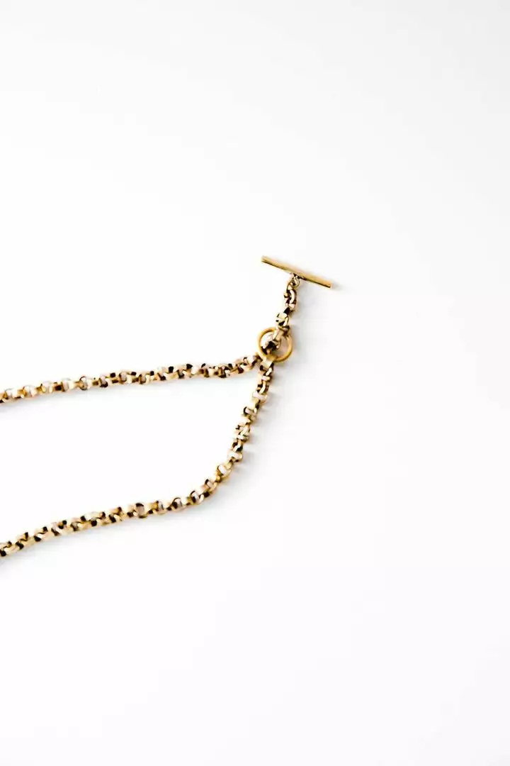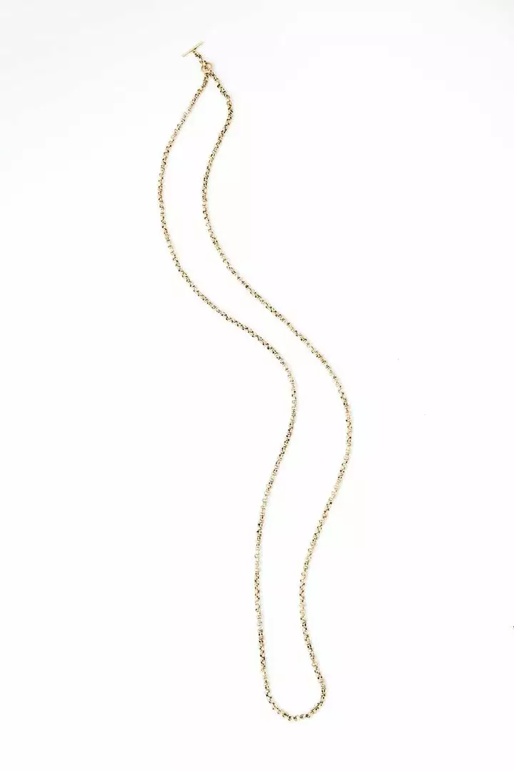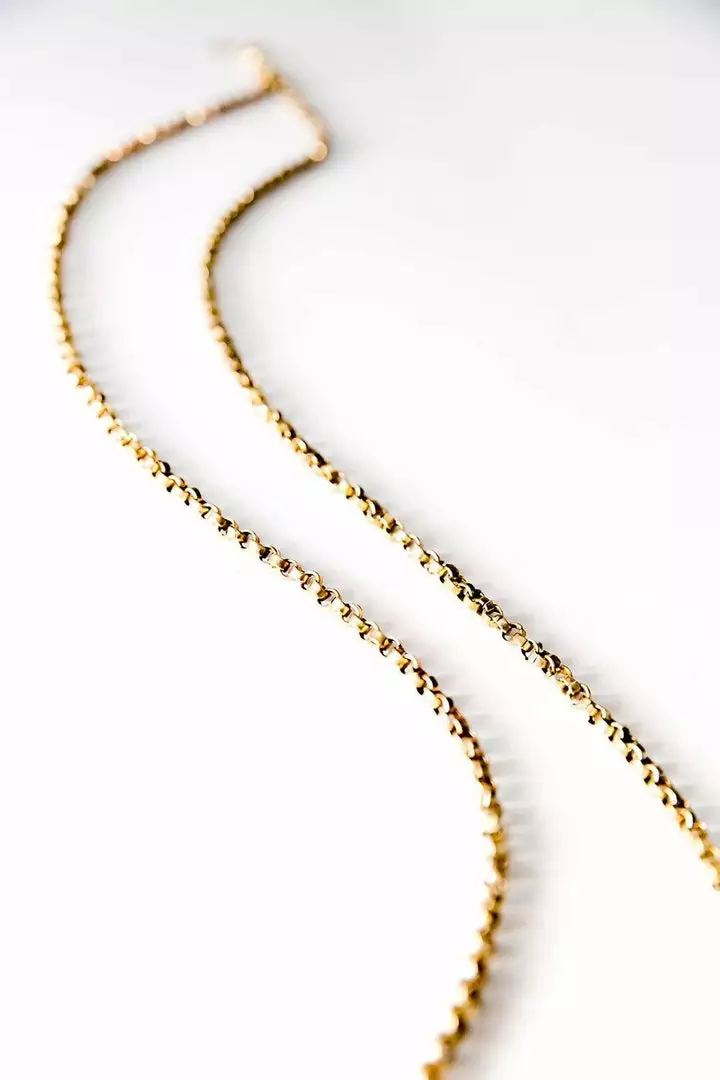 The tiniest of links handcrafted to make a layerable short necklace (17″) or a long rope necklace (44″) to be worn long, doubled, or tripled. A vintage-looking piece that gives subtle glam.
