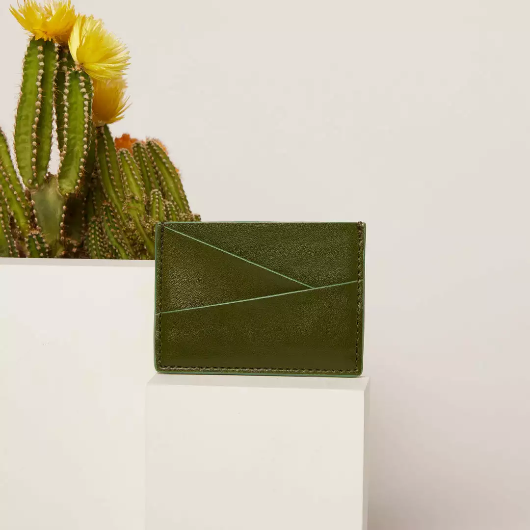 Compact cardholder with geometric design, crafted from natural cactus and plant-based materials. This unique cardholder is all you need for a quick errand, with just enough space for an ID, cash and ATM cards. The sleek appearance of will also complement any outfit.