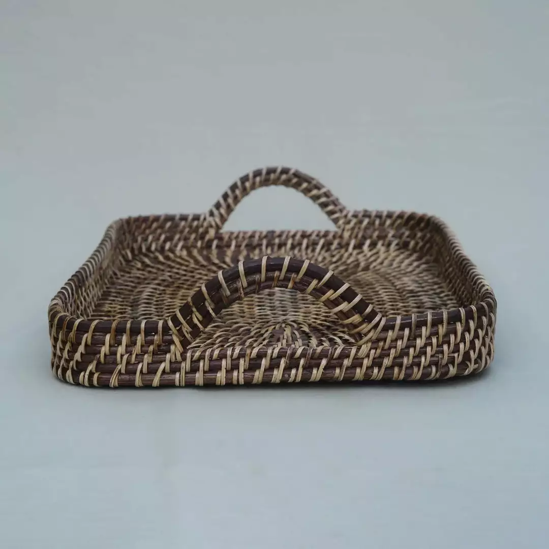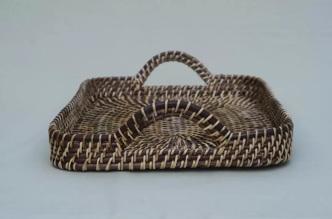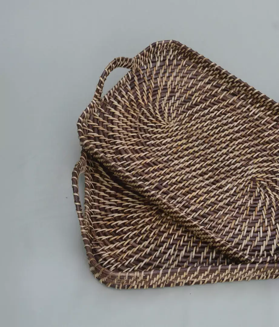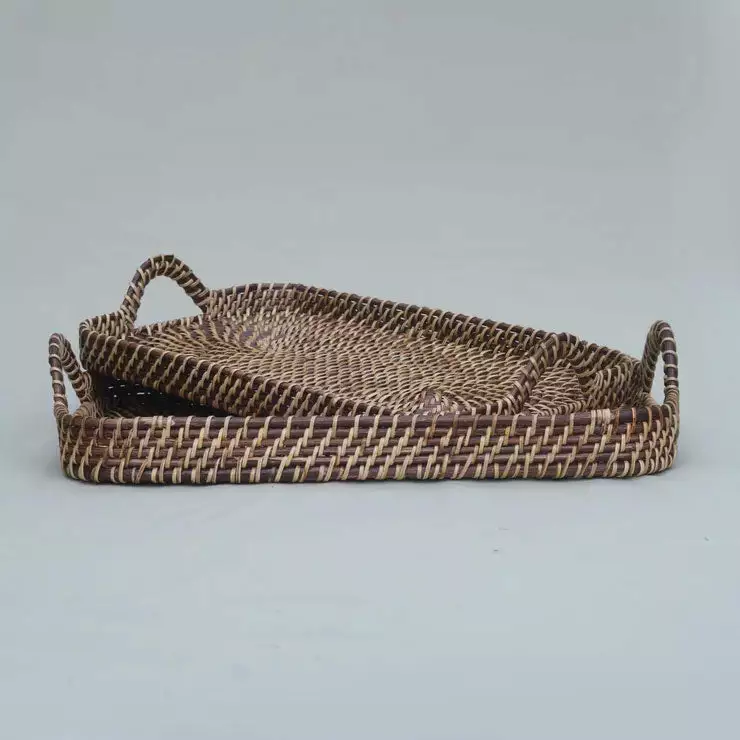 The Brown and Natural Rattan Rectangle Trays features natural rattan strips woven with brown rattan sticks to create a dynamic natural texture.