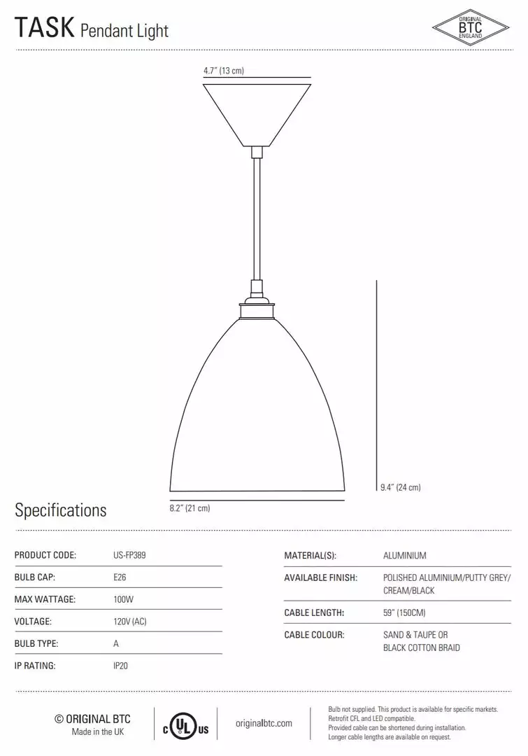 Original BTC is a family-owned and family-run lighting company based in London, England using only the finest natural and raw materials sourced in the United Kingdom for their high-quality, handmade lighting. Each piece of Original BTC’s exemplary table, floor, pendant and wall sconce lighting are crafted with care by ceramicists, metalworkers, and nautical craftspeople dedicated to making only the world’s finest lighting. Original BTC’s lighting is recyclable and is made to last generations using bone china light fittings, solid aluminum, copper, brass, and iron. Each piece of lighting is accentuated by cotton braided cables, exceptional satin chrome bases and a beautiful array of colored shades. All Original BTC’s products are UL certified, all components made in England, and all workers are paid a living wage.