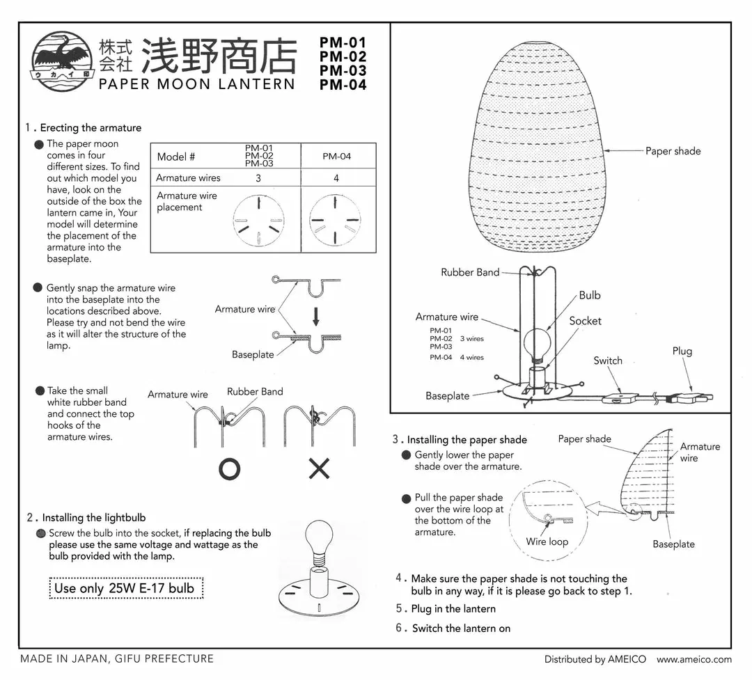 Japanese washi paper lamp shade omitting a warm, ambient light. To be use on table top or floor; switch on cord. Handmade in the Gifu prefecture of Japan for 90 years, this collection of Washi table lamps speak softly with their halcyon shape and warm diffusion. The simplicity of their structure is characterized by a wire armature that dilates a continuous spiral of bamboo filament and rice paper. Flat packed and gift boxed, the experience of taking an Asano light out of its box is like unfolding a precious silk.