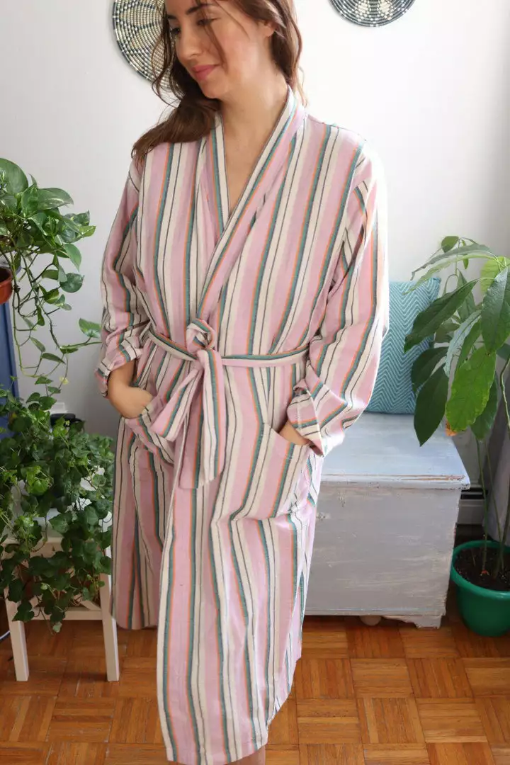 The Kai Robe is a modern spin on the classic Turkish towel that makes a lightweight bathrobe or a luxurious garment to wear while relaxing at home.