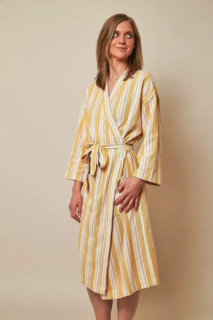 The Boho Mustard Robe is a modern spin on the classic Turkish towel that makes a lightweight and quick-drying bathrobe or a luxurious garment to wear while relaxing at home. Turkish towels (or peshtemals) have been used for centuries in hammams, the traditional Turkish baths, where bathing is a slow, relaxing ritual rather than a quick, daily need.