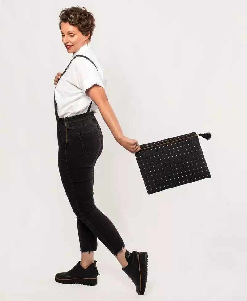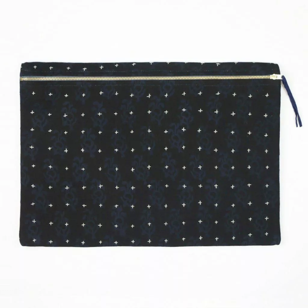 Accented with tiny cross-stitch details, this oversized clutch is sure to become your go-to accessory. Use this zippered pouch as a clutch during a night out or as a sleeve to transport your laptop to and from work.