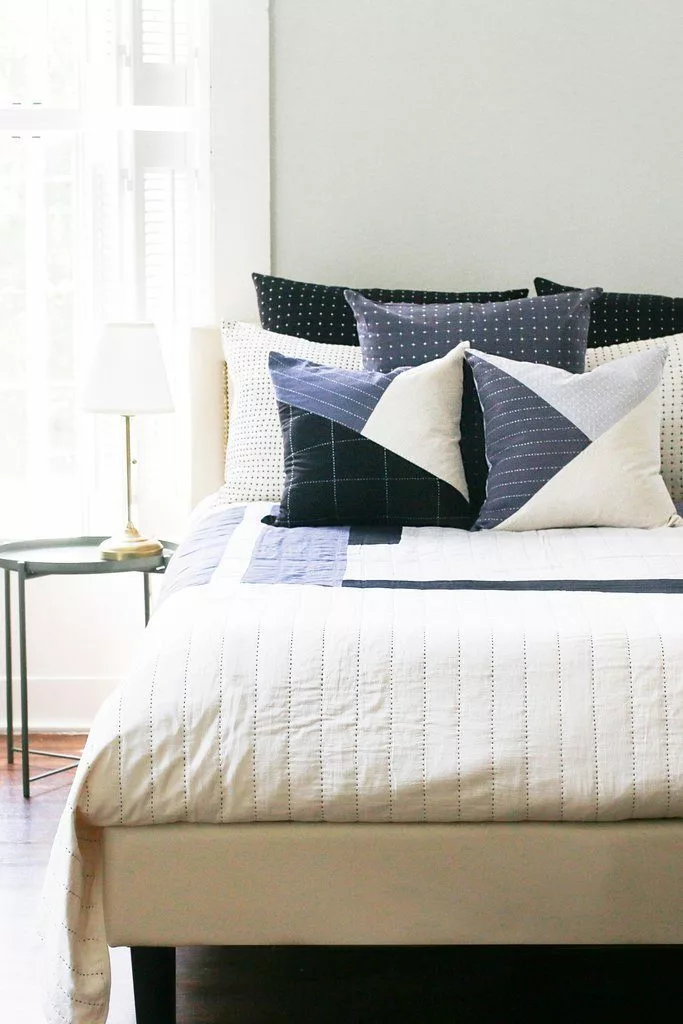 The Maya Quilt blends traditional kantha quilting techniques with contemporary geometric designs. Handcrafted with organic cotton, this beautiful heirloom colorblock quilt features detailed stitch patterns and paneling, creating bold intersections of color and texture.