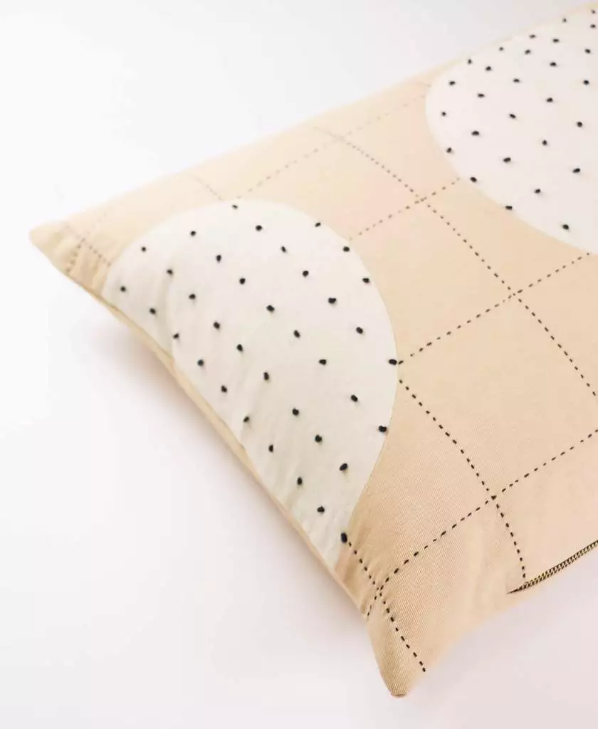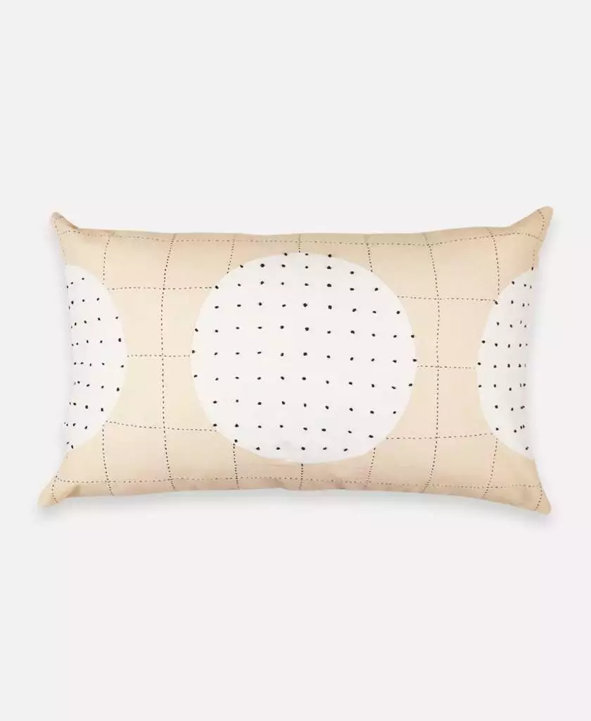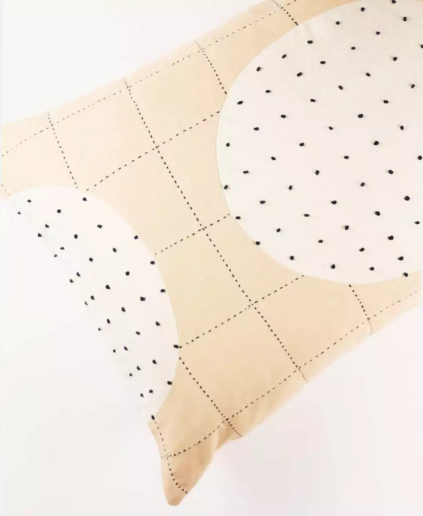 Inspired by the Crescent Lattice Quilt, this pillow features a simple grid stitch overlapped with a circular design with contrasting tiny French knots throughout. As a modern interpretation of the moon, this pillow pairs well with the Bone Cross Toss, Charcoal Grid Toss or makes a bold statement alone.
