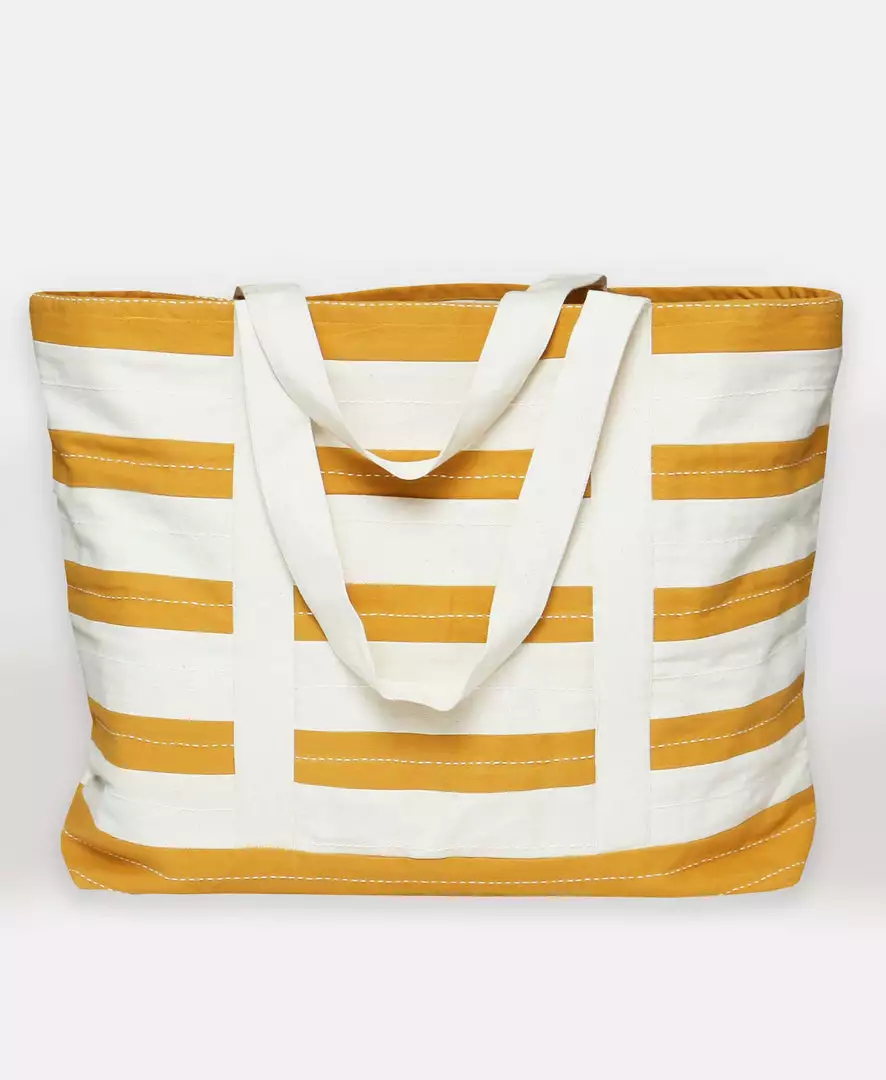 This canvas tote bag is as versatile as it is functional. The delicate hand-embroidered kantha stitch adds a level of character and texture to the classic Americana stripe design. Constructed with a durable duck cotton canvas lining, this striped tote bag features both interior and exterior slip pockets to help better organize your most used items. From everyday errands to farmers markets to the beach, this bag is with you through all of life’s adventures.