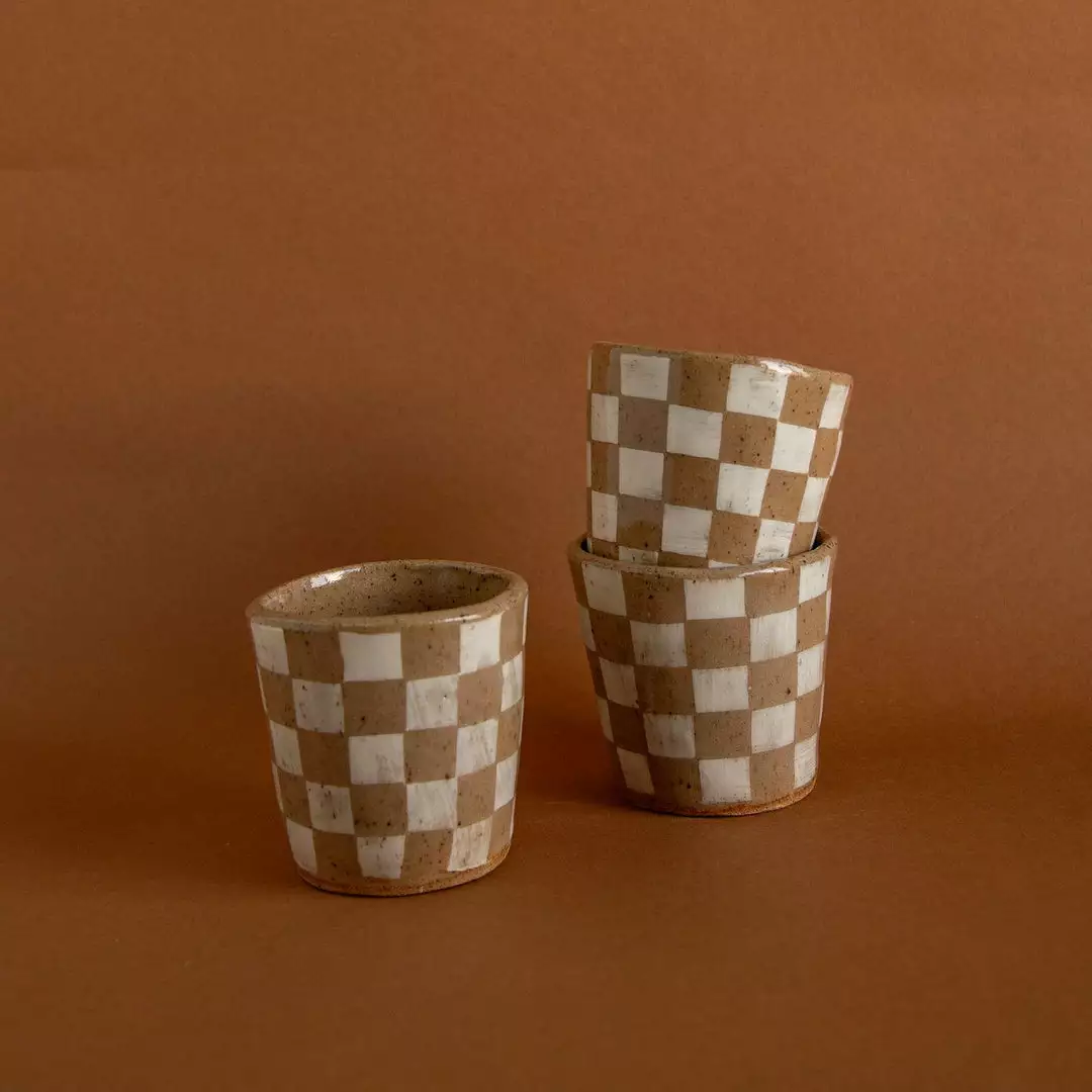 Featuring a hand paintedΒ daisy or checkered pattern, theseΒ tumblers will brighten up your morning routine. Made with a buff clay and finished with a white, shiny clear glaze.Β Mix and match with the Everyday Bowl and Ceramic Mug to create a show stopping tablescape.Β