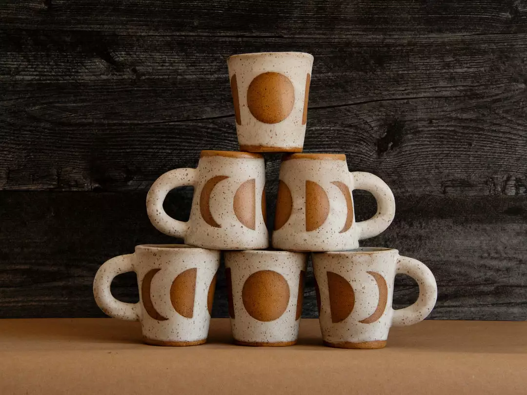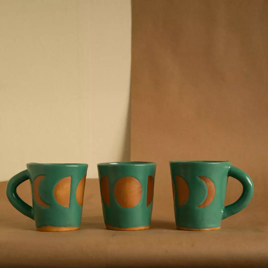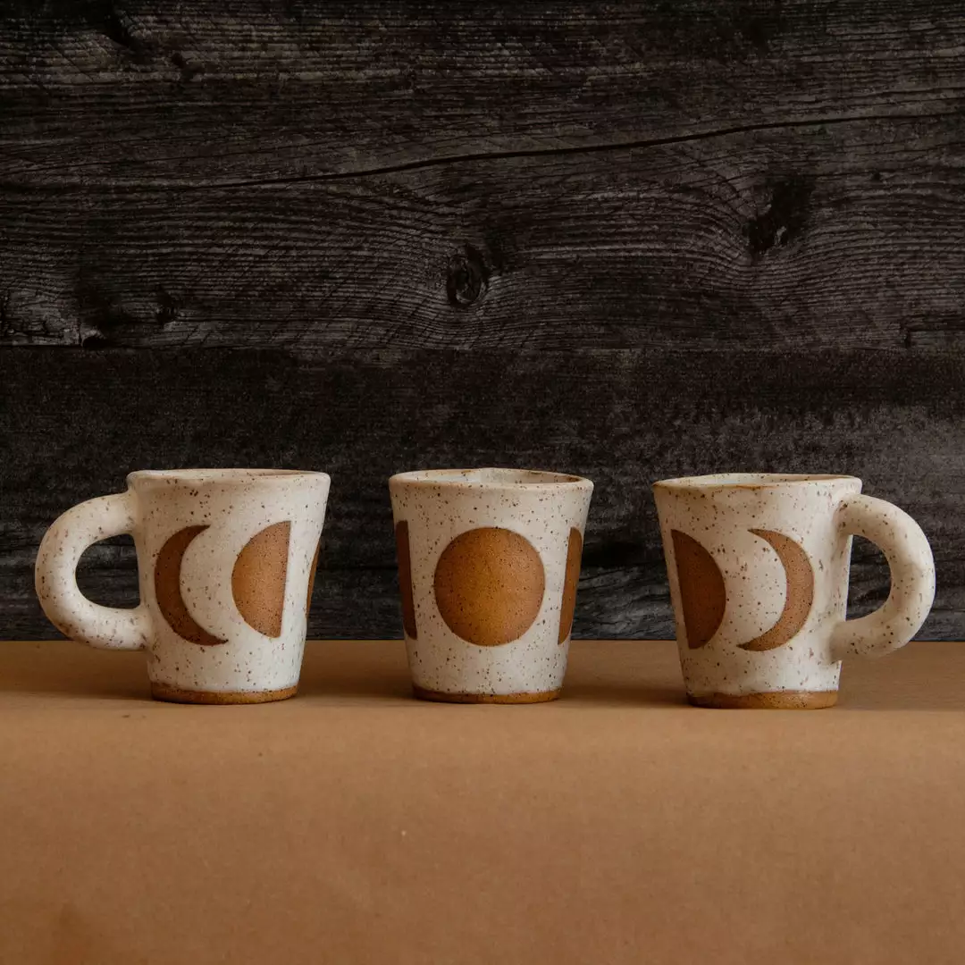 Features a 360 degree lunar phase pattern. Available in buff clay with a matte white or spruce green glaze.