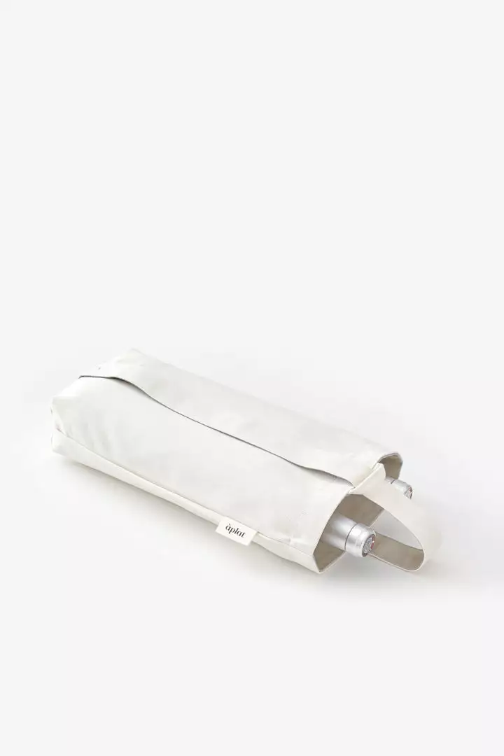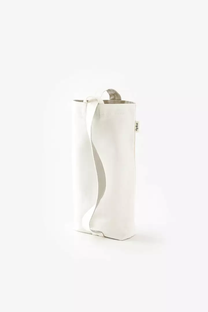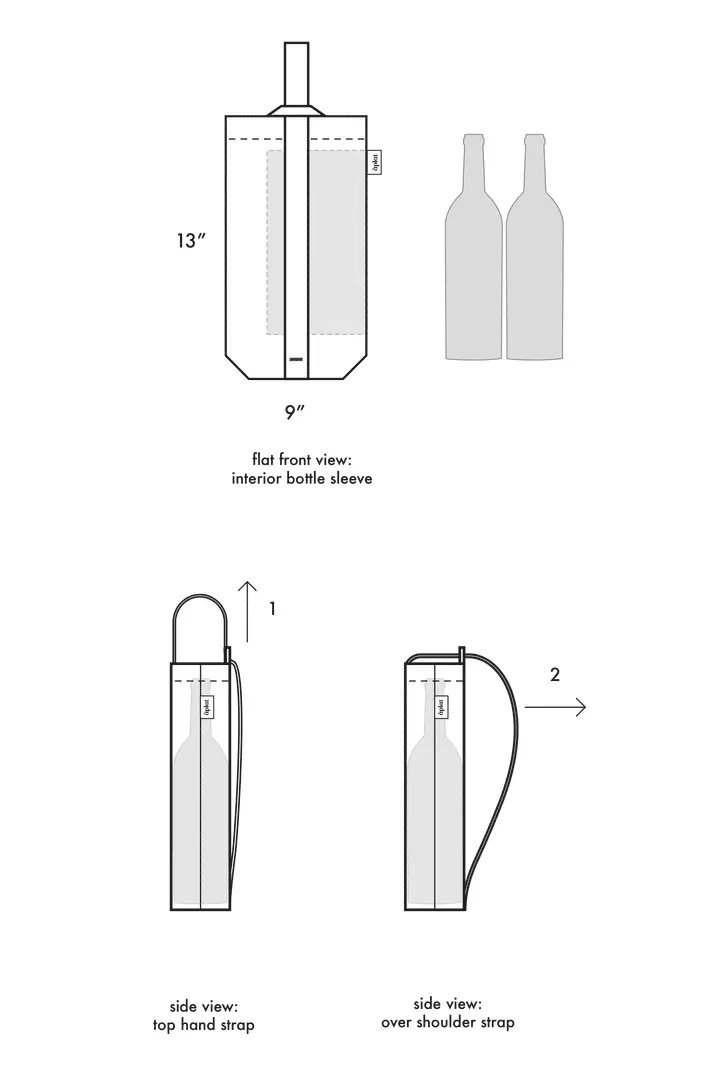 This Vin Wine Tote is designed to hold two bottles, with an interior sleeve for added protection. The adjustable strap can be carried from the top or slung over the shoulder. Perfect for casual picnics, toting wine, and gifting for all occasions. Zero-waste sustainable design. Holds two standard bottles as wide as 4 1/2” in diameter vertically, or a baguette and bundles of flowers.