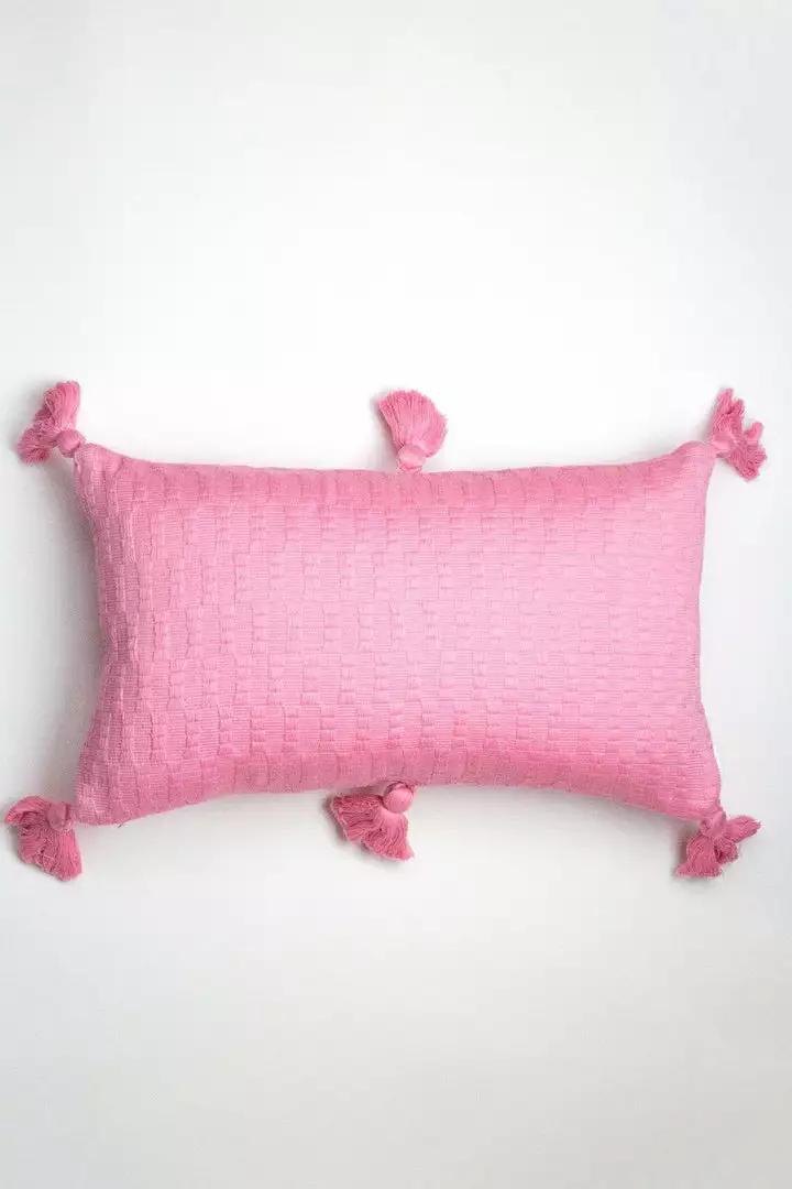 This pink pillow is inspired by traditional textiles from Almolonga, Guatemala. The cotton used to make this pillow was handwoven by artisans using a back-strap loom.