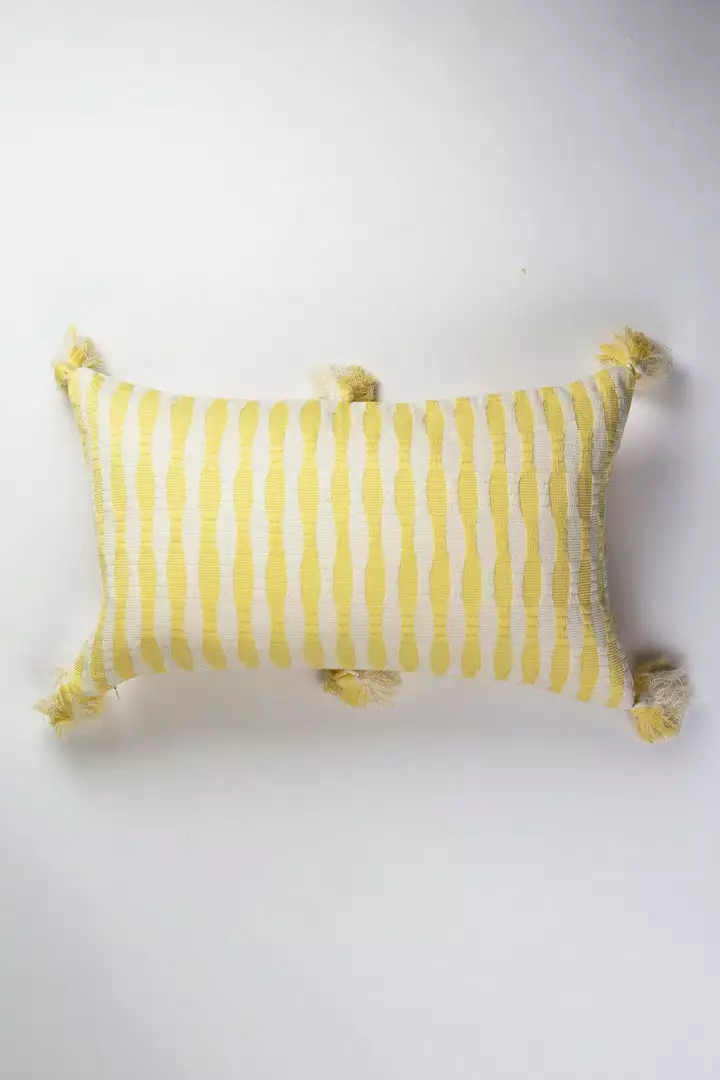 This yellow pillow is inspired by traditional textiles from Almolonga, Guatemala. The cotton used to make this pillow was handwoven by artisans using a back-strap loom.