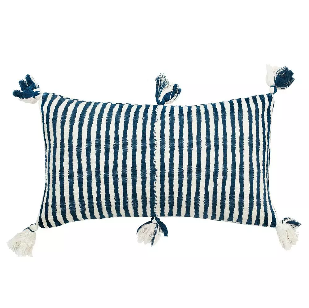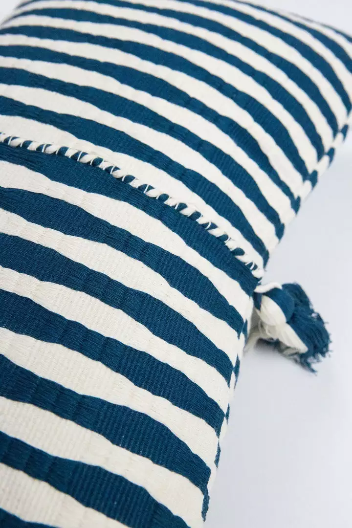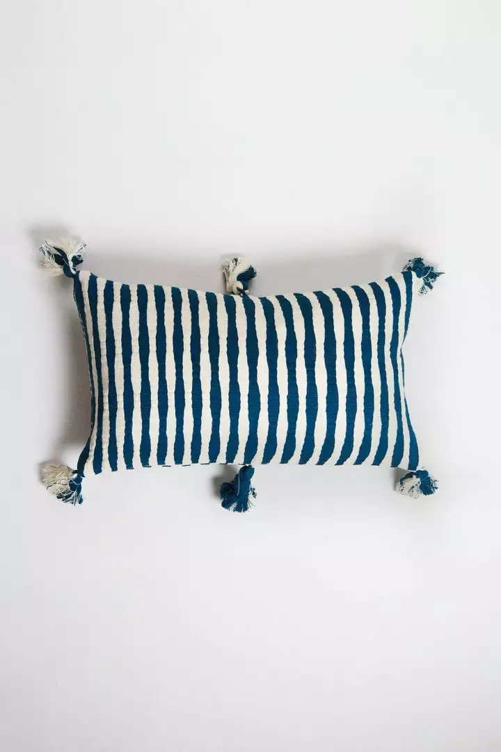 This teal pillow is inspired by traditional textiles from Almolonga, Guatemala. The cotton used to make this pillow was handwoven by artisans using a back-strap loom.