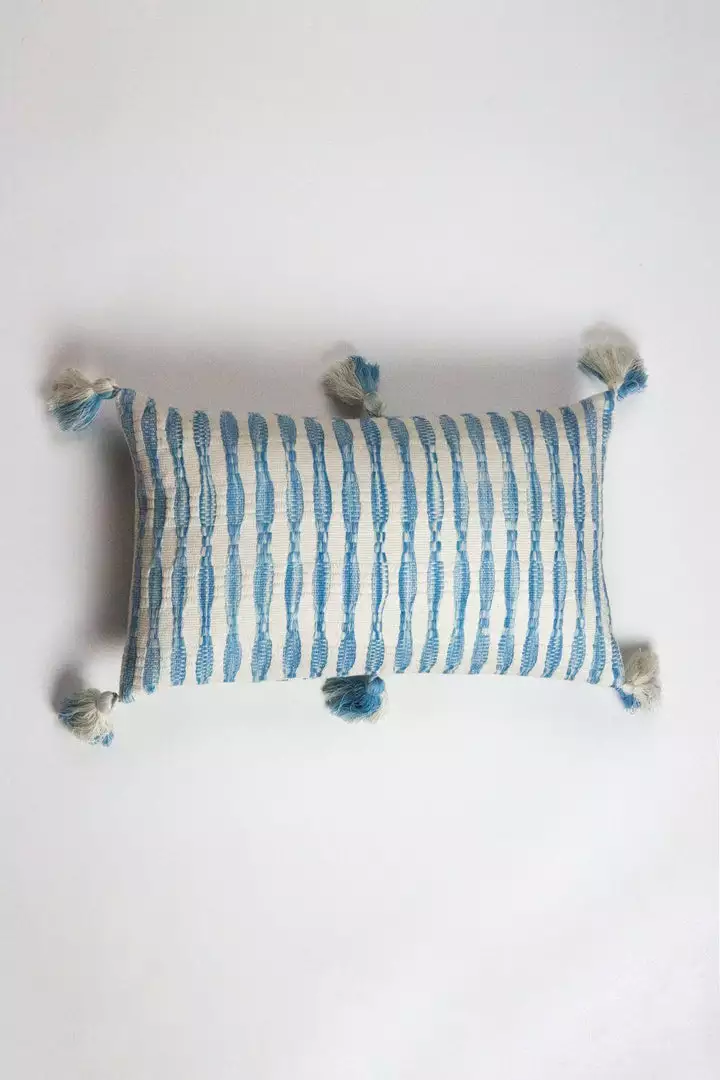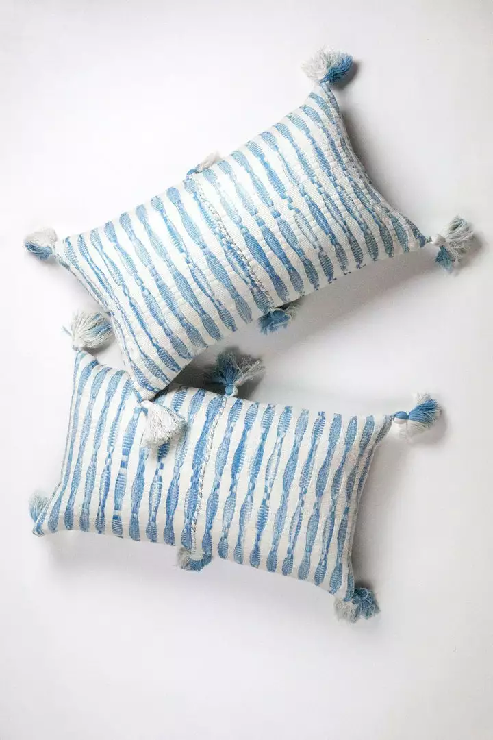 This indigo pillow is inspired by traditional textiles from Almolonga, Guatemala. The cotton used to make this pillow was handwoven by artisans using a back-strap loom. Naturally dyed washed indigo.