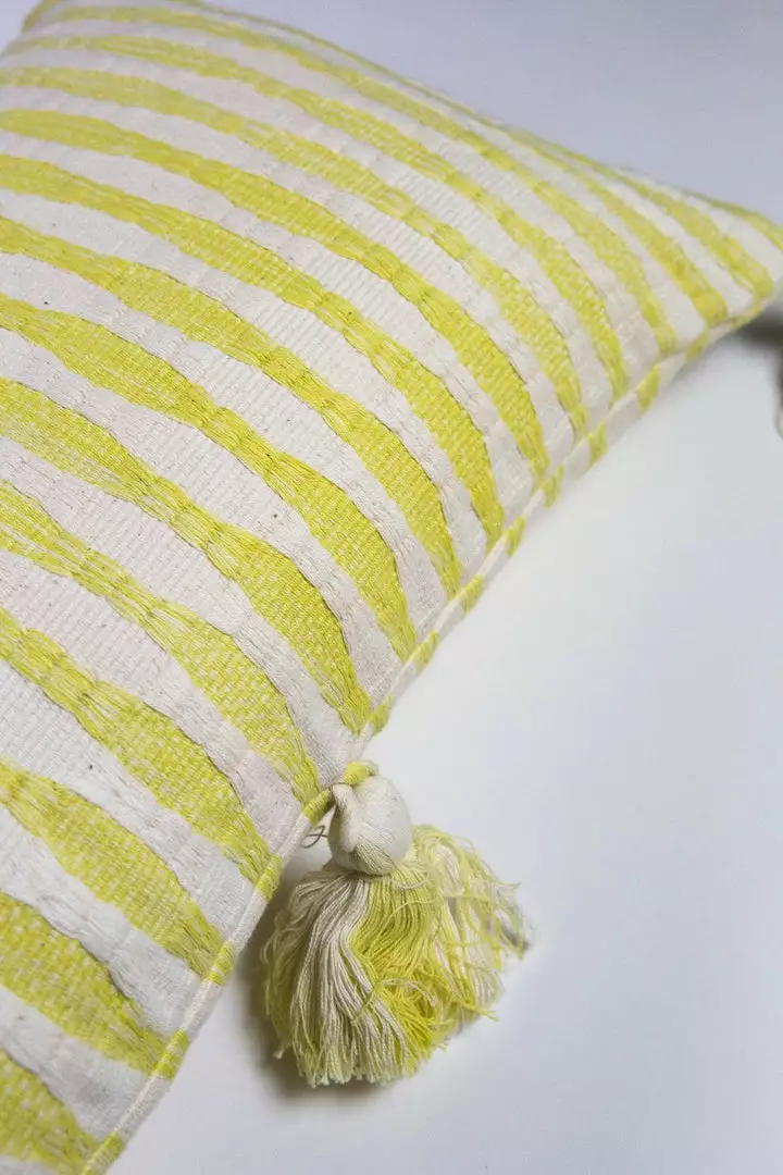 This yellow pillow is inspired by traditional textiles from Almolonga, Guatemala. The cotton used to make this pillow was handwoven by artisans using a back-strap loom.