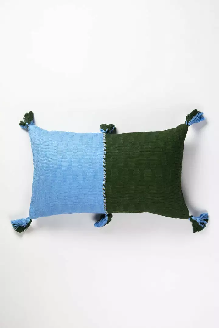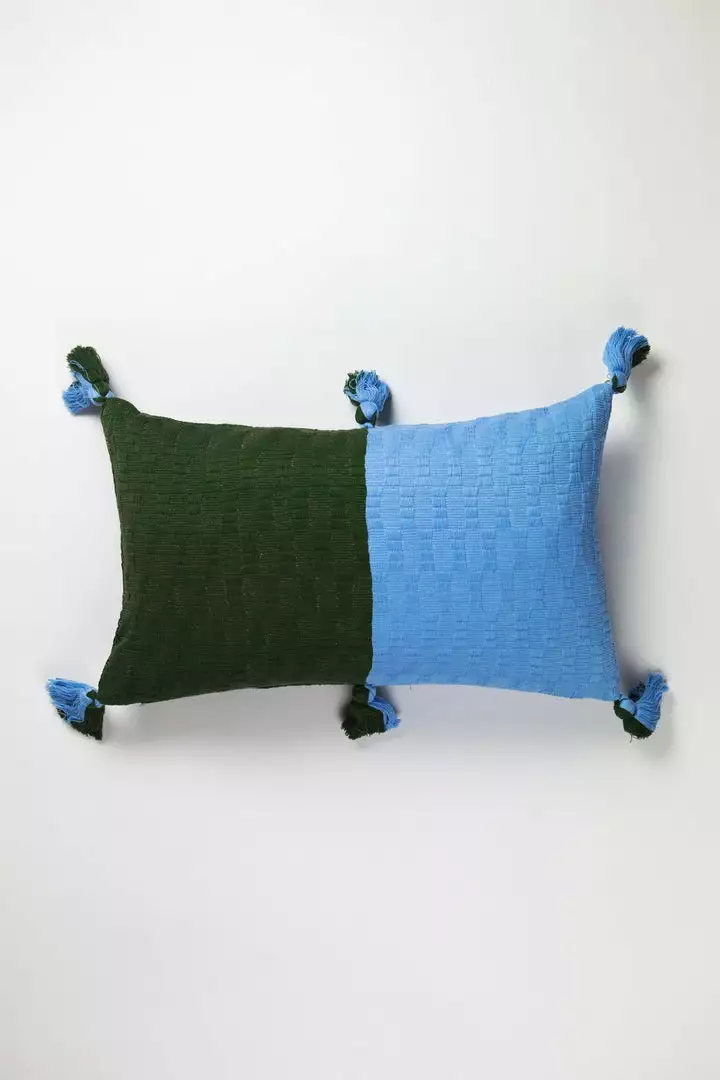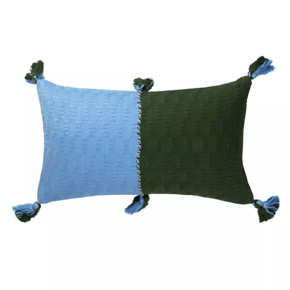 This olive and blue pillow is inspired by traditional textiles from Almolonga, Guatemala. The cotton used to make this pillow was handwoven by artisans using a back-strap loom.