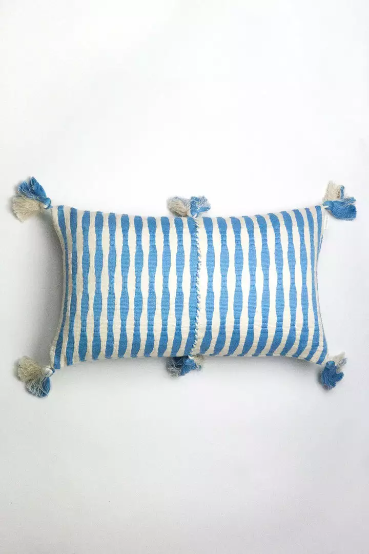 This sky blue pillow is inspired by traditional textiles from Almolonga, Guatemala. The cotton used to make this pillow was handwoven by artisans using a back-strap loom.
