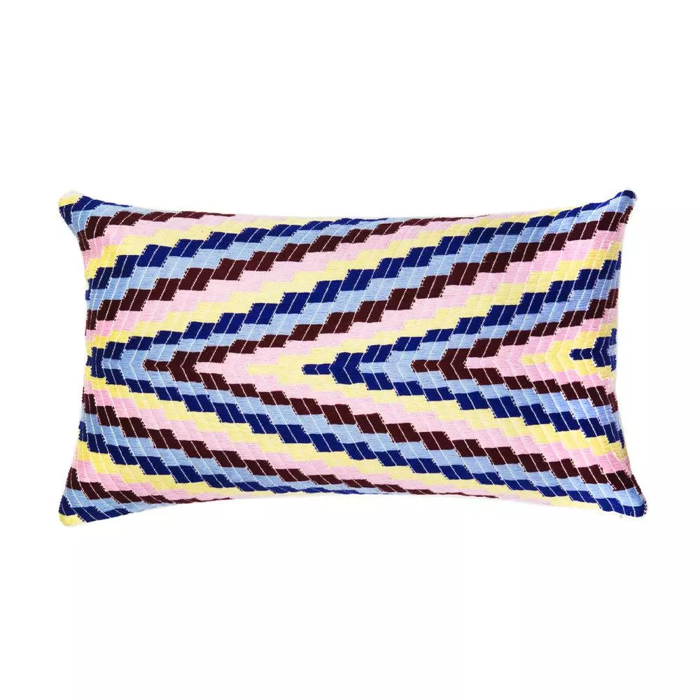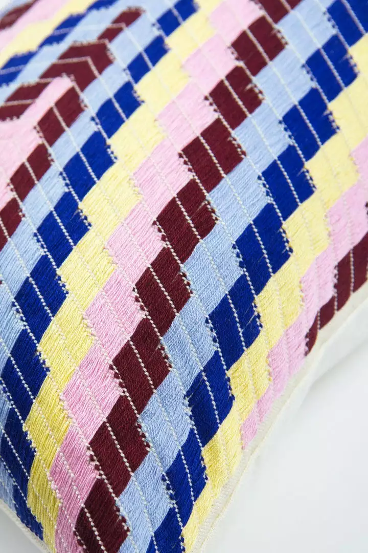 This multicolor pillow’s pattern is reminiscent of a traditional textile from Almolonga, Guatemala. The cotton used to make this pillow is handwoven by artisans on a back-strap loom.
