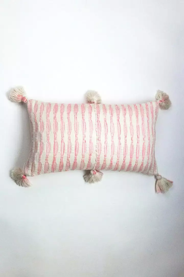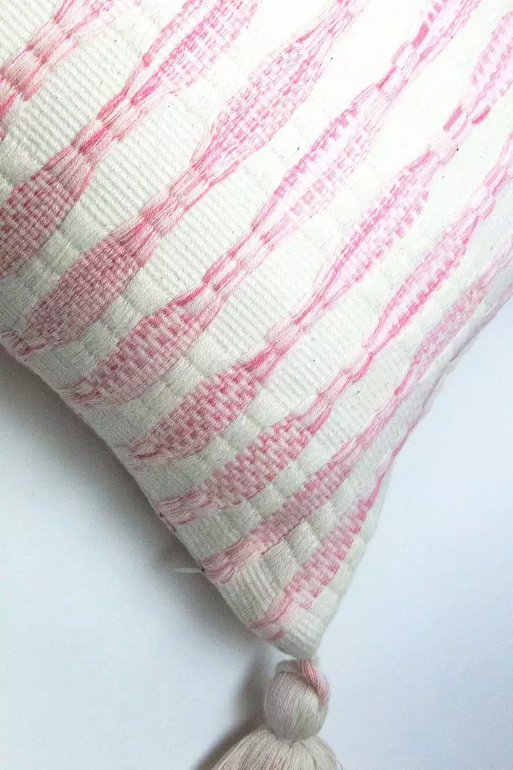 This pink pillow is inspired by traditional textiles from Almolonga, Guatemala. The cotton used to make this pillow was handwoven by artisans using a back-strap loom.