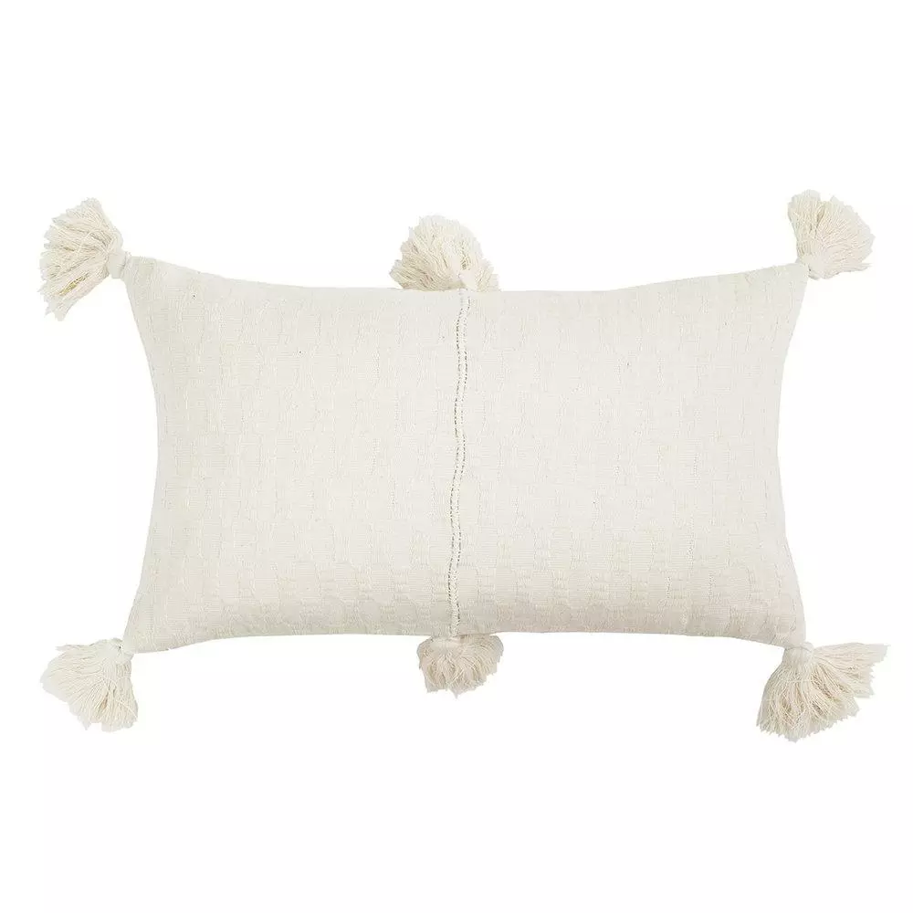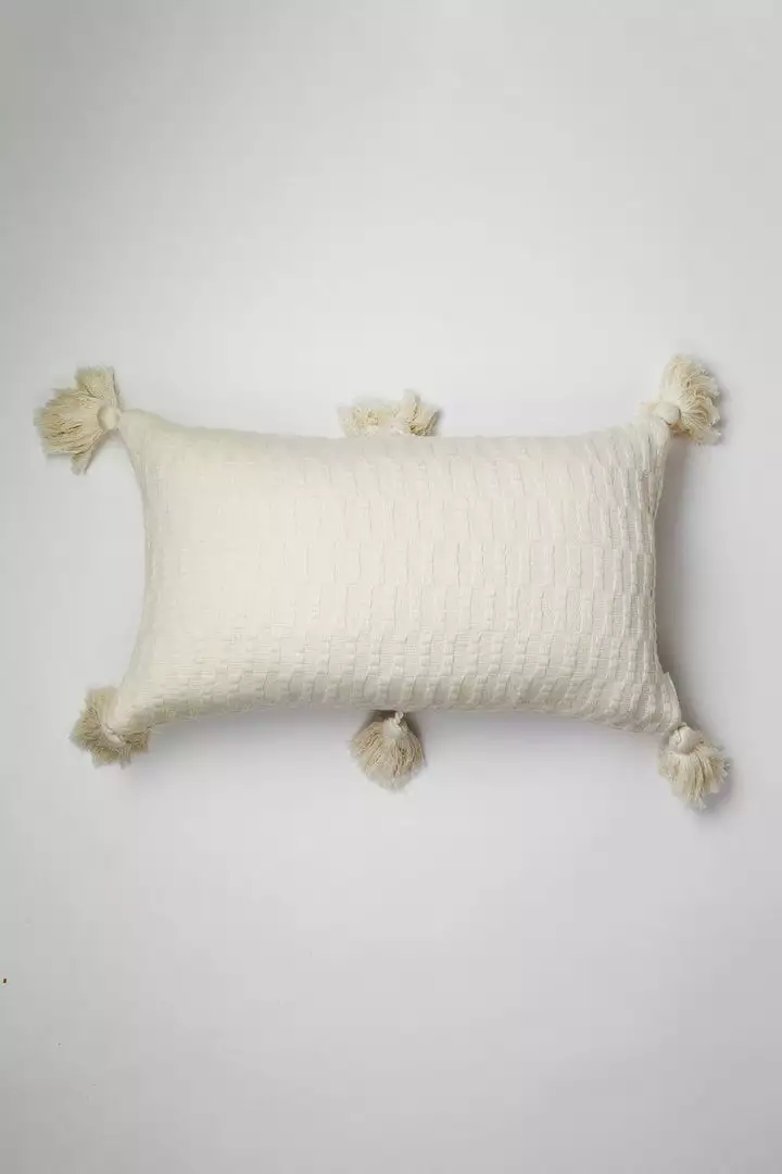 This white pillow is inspired by traditional textiles from Almolonga, Guatemala. The cotton used to make this pillow was handwoven by artisans using a back-strap loom.