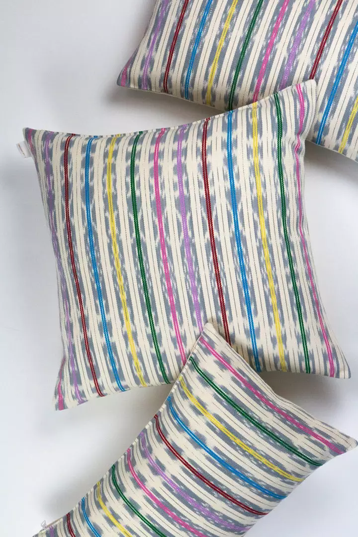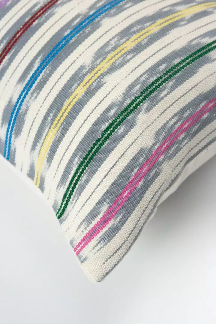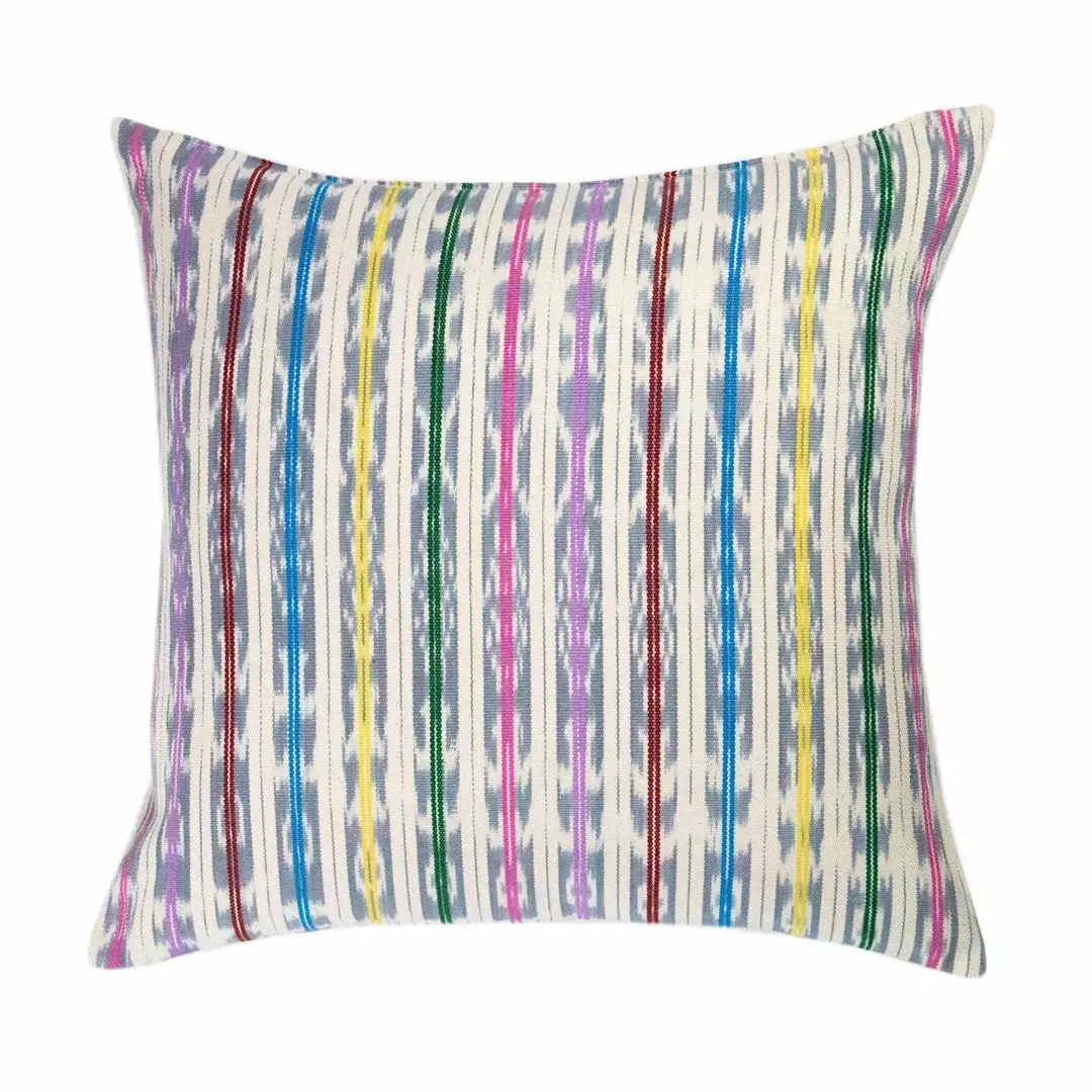 This ivory, gray and rainbow throw pillow, ethically handwoven by artisans in Totonicapan, Guatemala on traditional footlooms, will add a suble texture and pop of color to any space in your home.