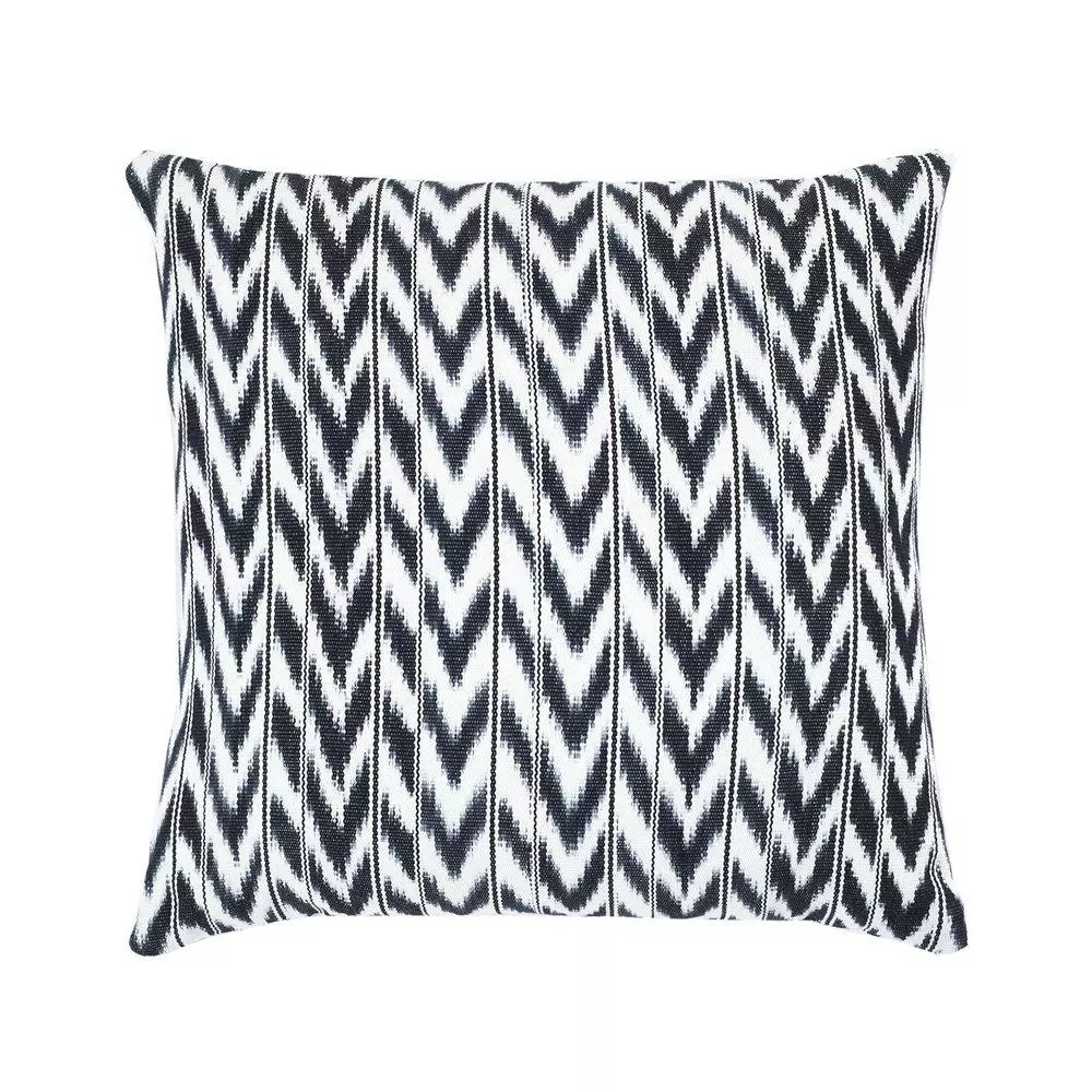 This black and white pillow is woven by artisans using a footloom. It features an intricate dyeing technique specific to the Totonicapan region.