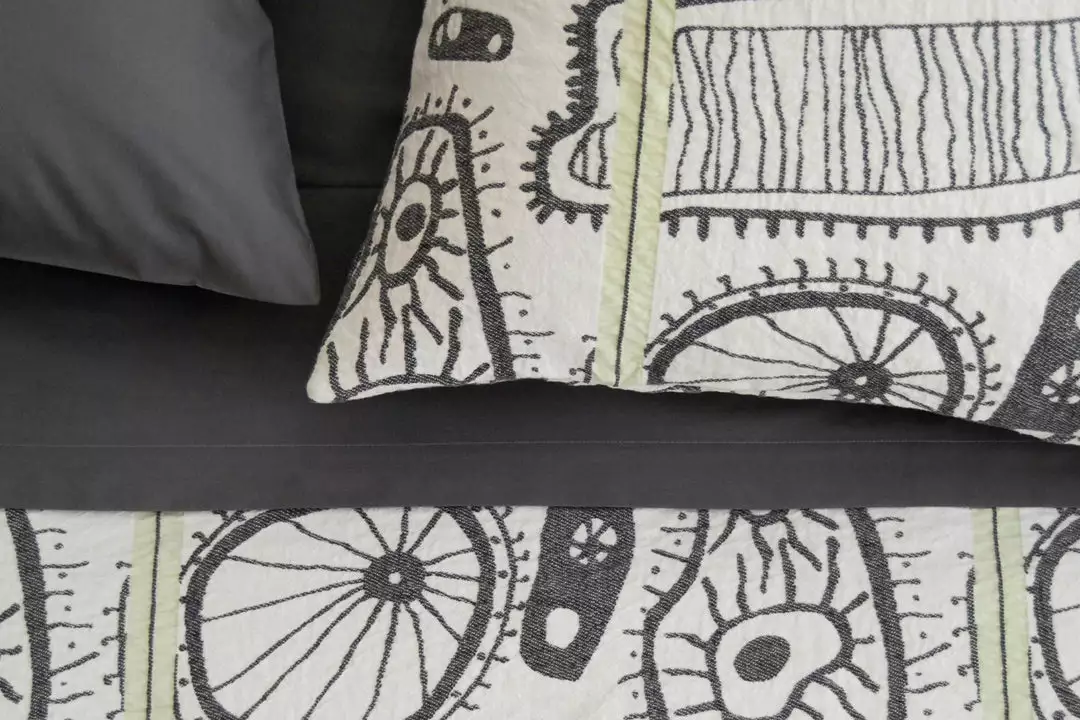 The word cell is derived from cella, Latin for ‘small room’, and this graphically lively heavyweight coverlet adds an exuberant touch to any contemporary bedroom. Pairs well with both earthy and cooler solids. Coverlet has a 1″ hem.