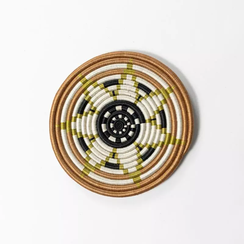 These fresh designs will look beautiful in your kitchen, on your dining room table, or hanging on the wall. Sisal fibers are steeped Rwandan tea leaves to create tea color. Mix and match with woven bowls and wall hangings for a striking and dynamic gallery wall.