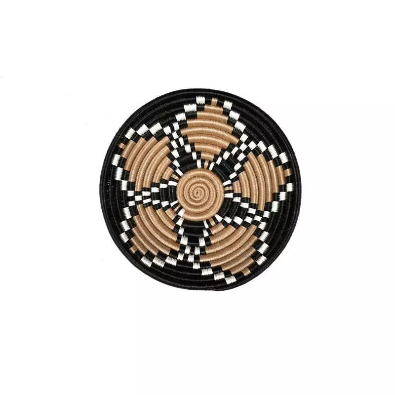 The large woven bowl is flat on the bottom and makes a beautiful tray for serving or display. Imagine the medium bowl on your dining room table filled with warm bread or fruit. The small bowl is a beautiful way to hold jewelry or keys, or it may be filled with small treats and used as a gift basket. Each woven bowl has a loop on the back for hanging- the trio looks gorgeous on a blank wall.