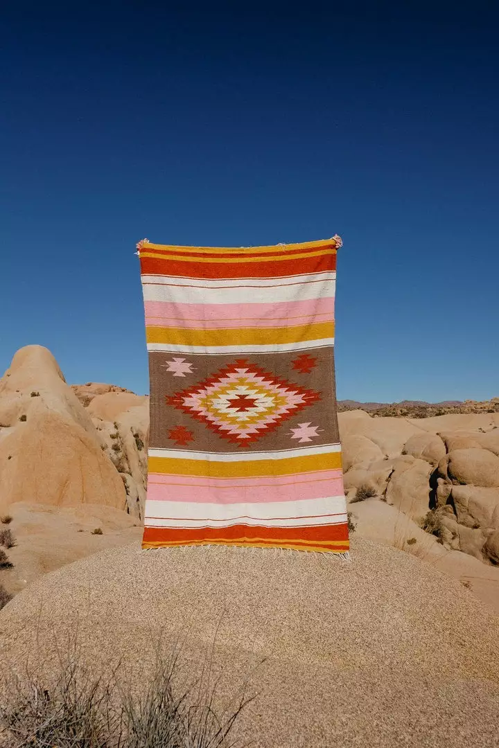 Perfect for hanging out at the park, beach, or even keeping warm around a campfire. Your new blanket comes rolled up with a handmade leather strap, making it ready for any adventure. These vibrant, modern blankets are handwoven in Mexico using upcycled yarn from the garment industry.
