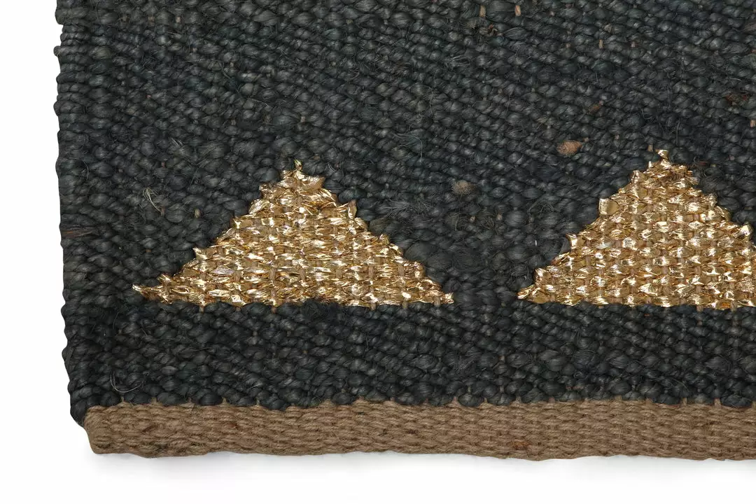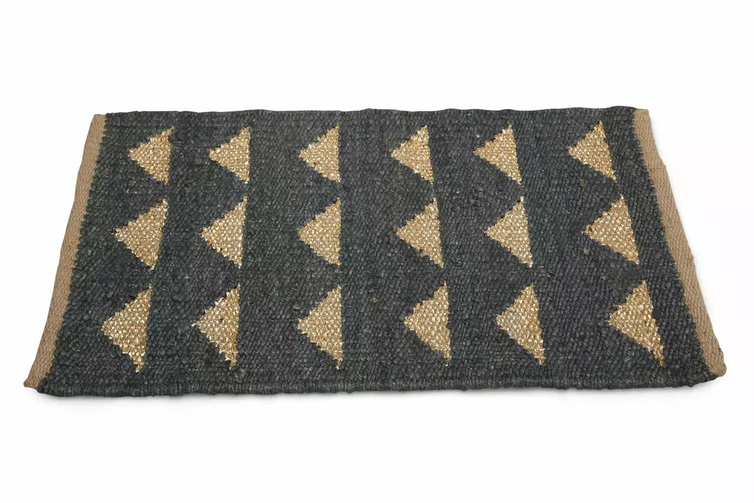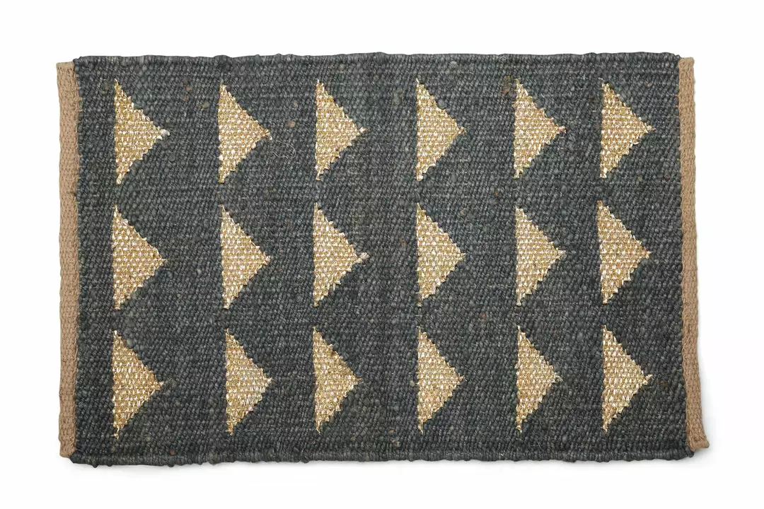 A hand made geometric design on Panja loom and natural hues give this Jute Doormat its boho charm. The durable jute weave stands up to heavy foot traffic, making it ideal in a mudroom or entry. Features gold yarn to add a bit of glam.