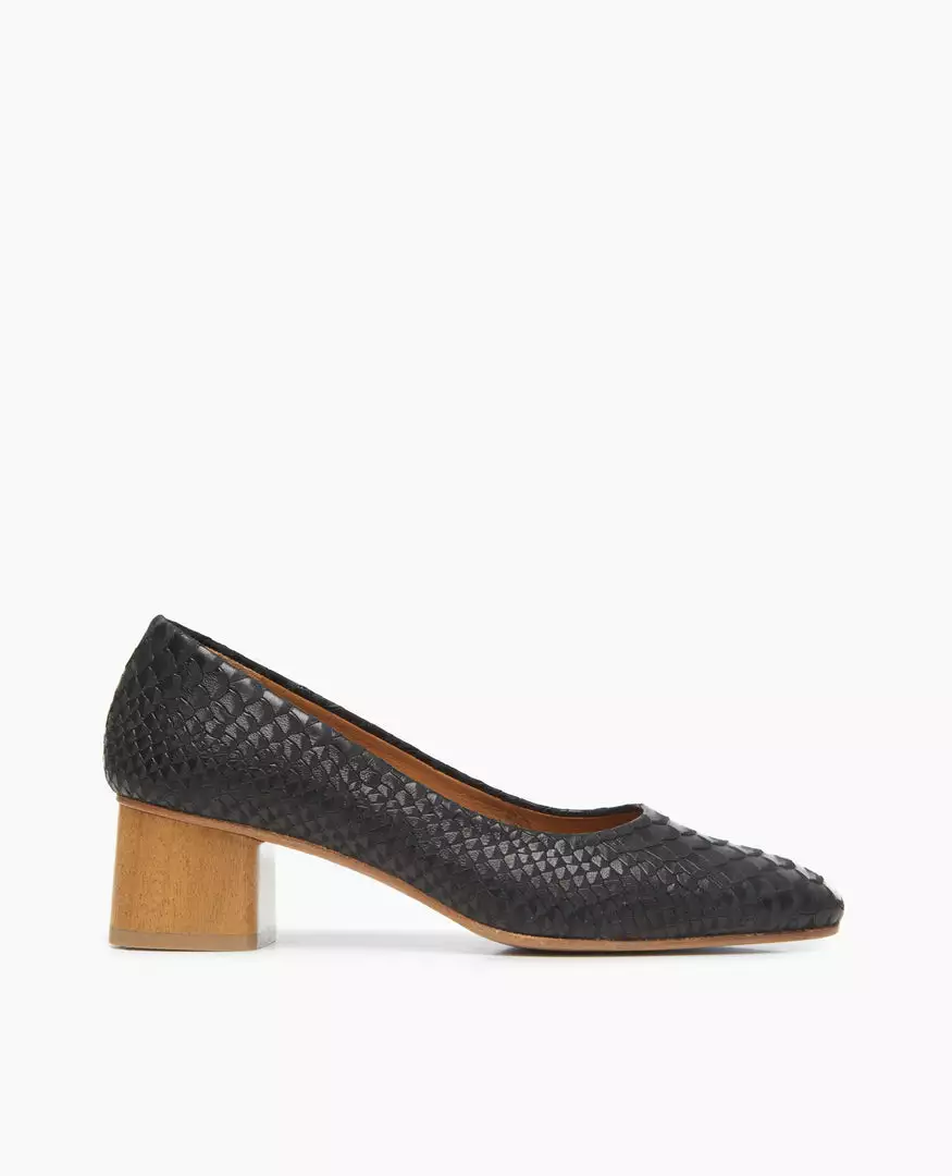 This classic pump in soft, lizard textured black leather and solid-wood block-heel for an unparalleled, polished look. Slip-on. Perfect height for everyday wear.