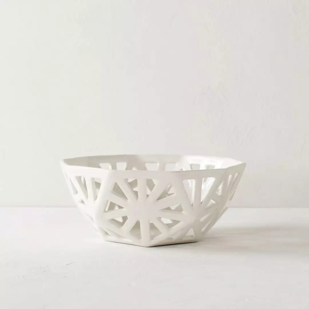 The Geodesic Fruit Bowl features repetitious, hand-carved, architectural design cut outs. The modern, yet timeless, design will serve as a statement piece within your home.