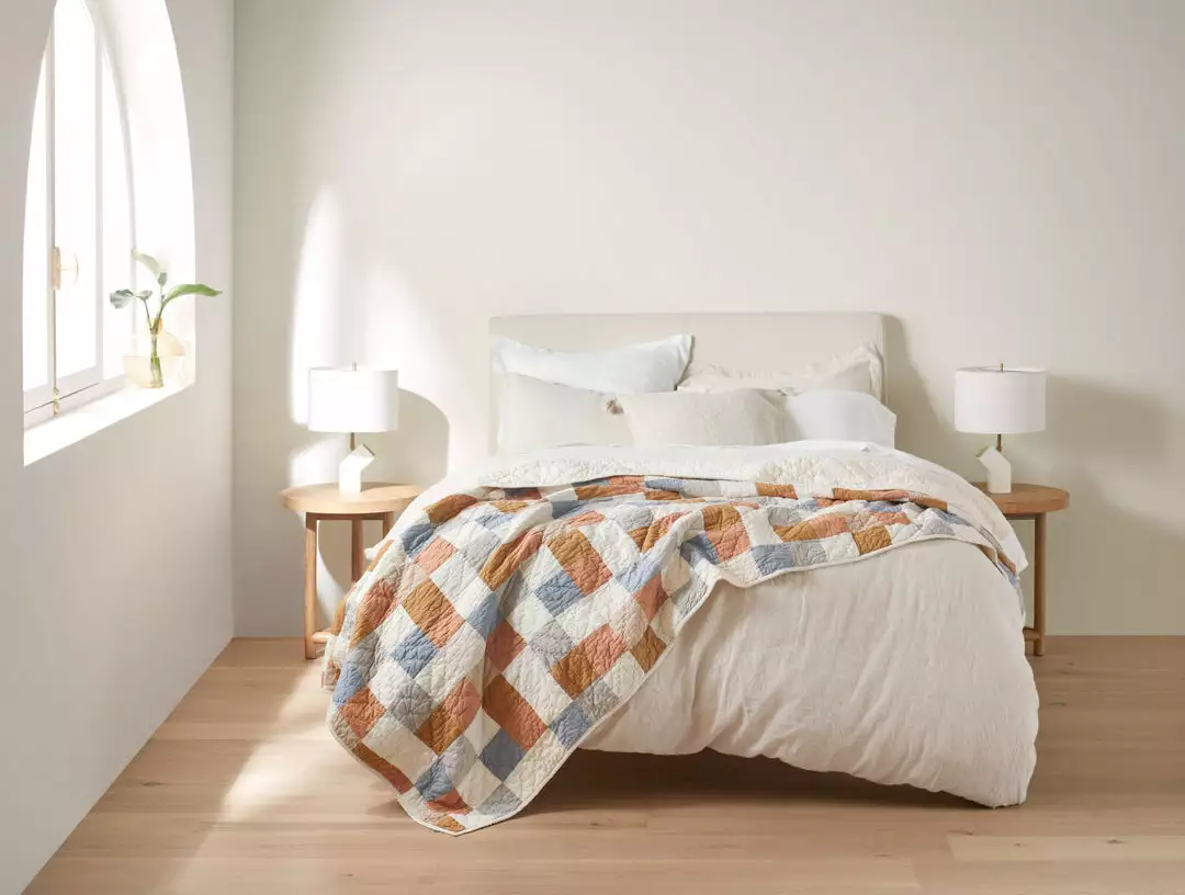 The Ashbury Quilt is a vintage-inspired quilt drawing from the artistry of traditional patchwork blankets, coats, and quilts. Made with 4×4 squares of Coyuchi’s Organic Crinkled Percale™ Sheets sewn into a checkerboard pattern, paying homage to the re-use of fabric remnants in classic quilting circles. Natural yarn is then handstitched into diagonal lines that hold the cotton batting in place. The underside is undyed Crinkled Percale™, which can be reversed for a neutral option.