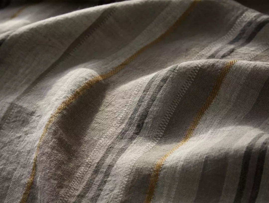 Blanket washed for day-one softness, the chambray base of this lightweight blanket uses different tones along the warp and weft to show off the signature texture of linen. Richly detailed, yarn-dyed stripes are inspired by a vintage Oaxacan blanket, with unique patterns that complement the larger bed blanket and throw.