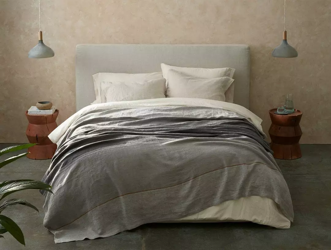 The bed blanket is designed with a color block pattern that runs horizontally along your bed. Large bands of plain weave canvas blend with twill, while stripes of dobby woven details highlight the transitions.