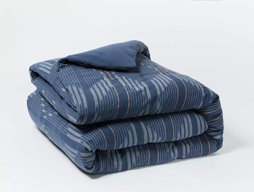 Inspired by a vintage African ikat textile, the Morelia duvet uses yarn-dyed organic cotton in a textural weave to create a pattern of lines, diamonds, and zigzags. Details woven in a heavier weight yarn punctuate the blues and grays with pops of brighter color. Prewashed for a soft, crinkly feel, the duvet is backed with organic cotton percale, so you can use it without a top sheet if you like. Machine Washable.