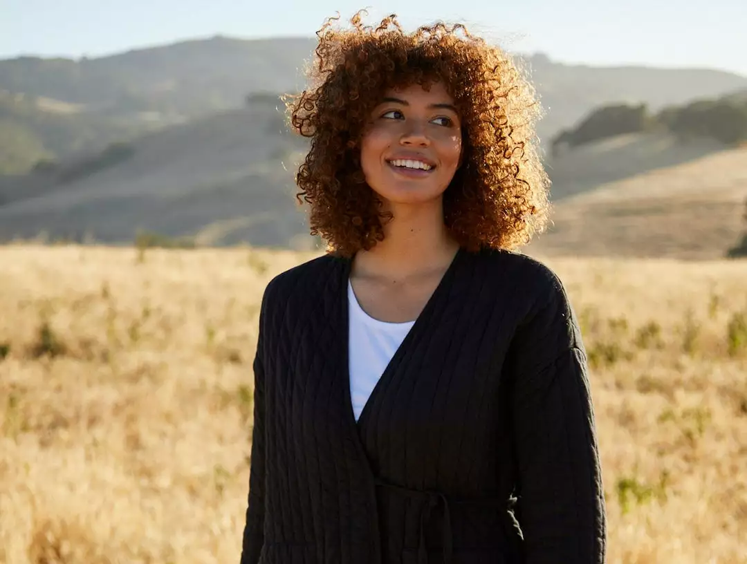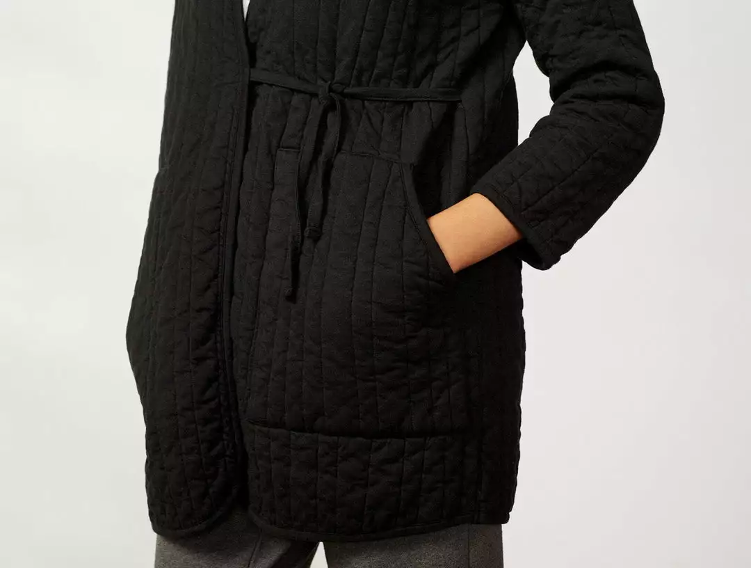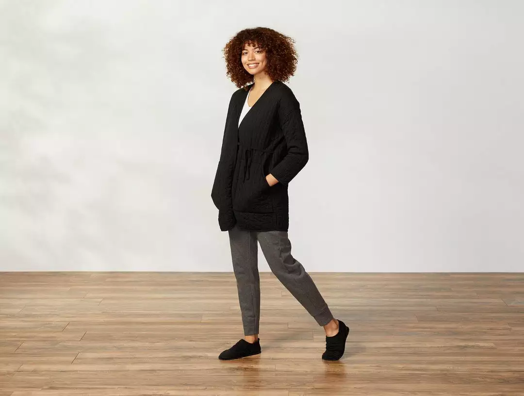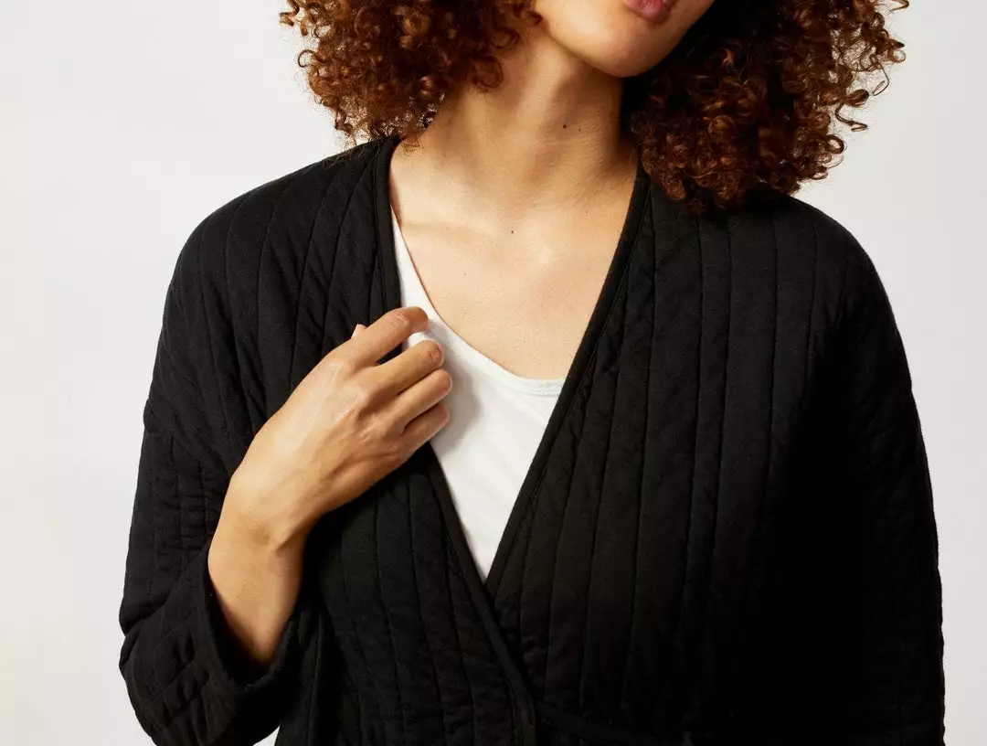 A soft, quilted jersey knit creates cozy warmth in a plush, cotton-filled cocoon shape. This all-day layer reimagines cotton filled quilts and comforters as something sleek and wearable that can be dressed up or down, depending on your destination. A relaxed quilting pattern creates irregular channels throughout, in a knit jersey for soft, flexible stretch that’s perfect for lounging. Binding trims the rounded neckline and hem.