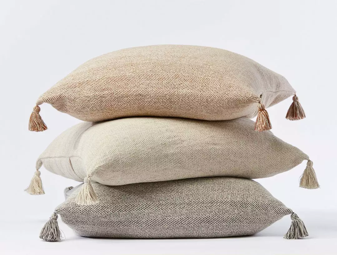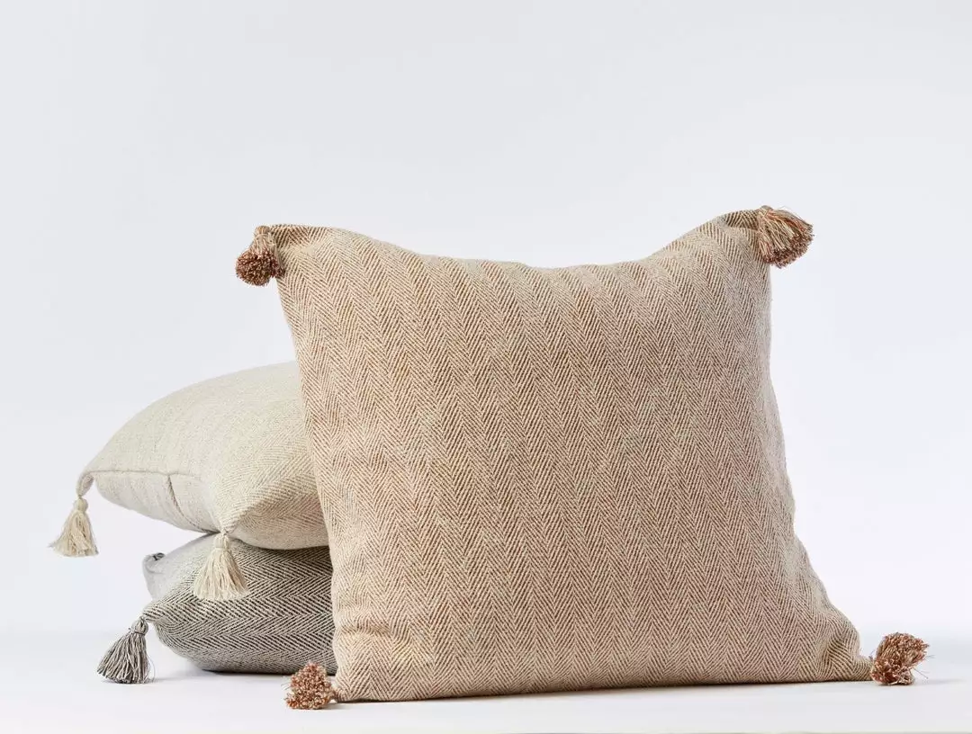 A textural herringbone weave highlights a refined blend of organic cotton and organic linen. The combination of yarns and fibers brings dimension and drape, with large hand-knotted tassels that showcase the full array of colors at each corner. Self-backed pillow cover is secured with an envelope closure in the back.