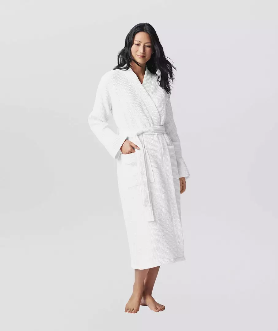 The classic spa bathrobe. Made from organic cotton in an airy, drapey waffle weave, it’s prewashed to be soft from day one and gets more so with every wash. Styled for men or women with a streamlined fit that keeps it comfortable and flattering with double belt-loops. All of Coyuchi’s organic cotton products are machine washable.