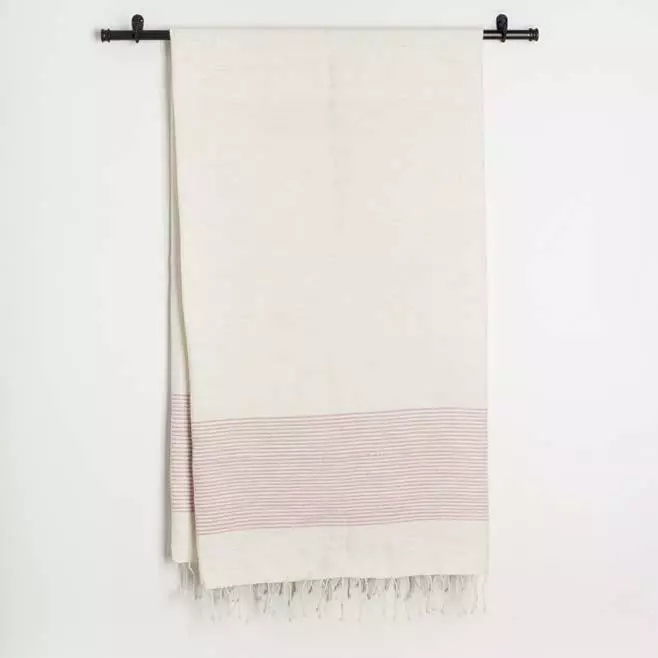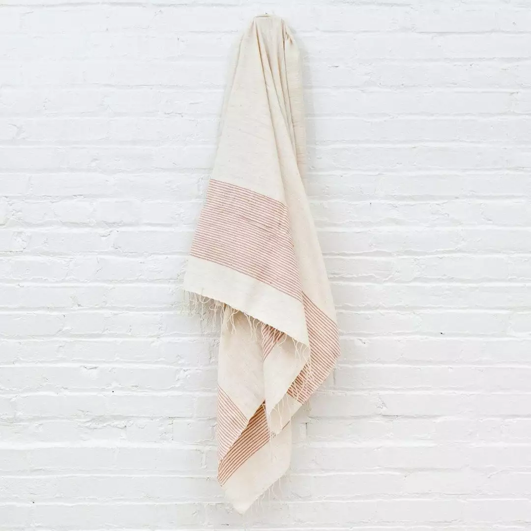 The blush Riviera Bath Towel features ribbed accents add texture and depth to a neutral palette of undyed natural cotton. These versatile artisan-made pieces can be used as bath towels, lightweight shawls and accent throws. Hand-spun Ethiopian cotton adds a uniquely rich texture that will continue to soften and become more absorbent with each wash and dry.