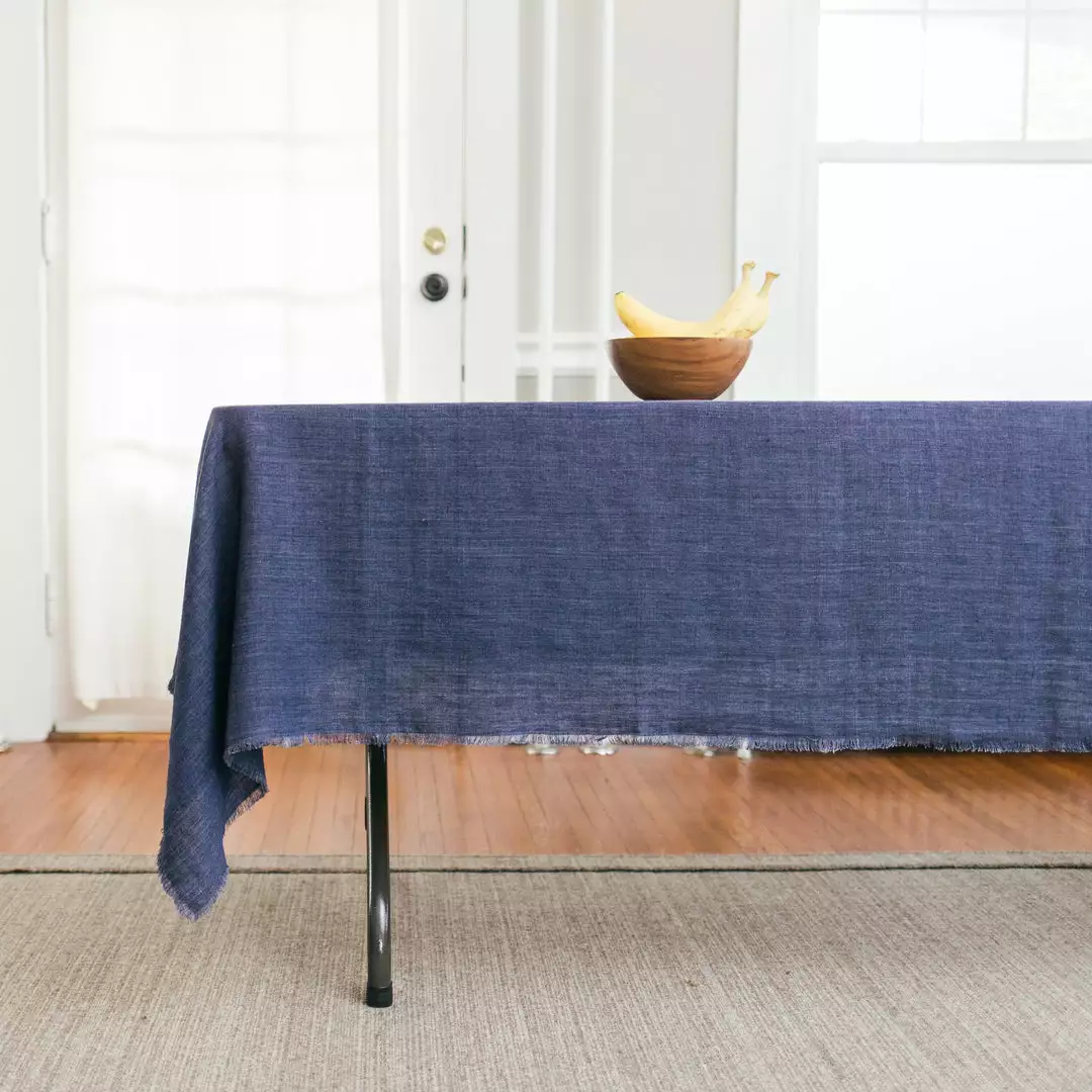In a quiet village in southwest India, this linen is meticulously woven, dyed and stone washed to perfection. Each is made from the finest imported Belgian flax and represents hours of artisan work. This versatile piece is a generously sized 84 x 60 inches and doubles a lightweight throw. Frayed edges add texture to a classic and timeless tablecloth.