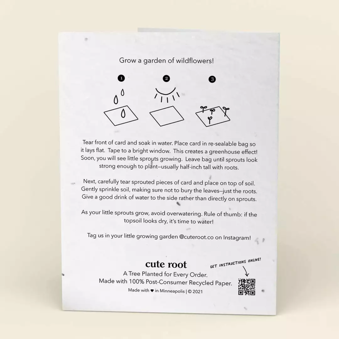 Whether it’s a special occasion or just because, these plantable cards will light up your loved one’s day. Your meaningful words will grow a garden of wildflowers. Printed to order to reduce waste. Cards contain a non-invasive wildflower seed mix that grows Alyssum, Catchfly, Siberian Wallflower, Black-Eyed Susan, and Baby Blue Eyes.