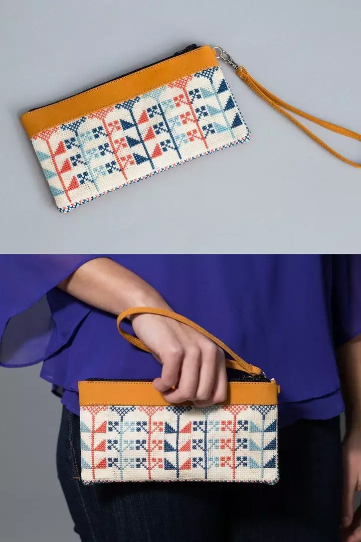 These tatreez wristlets are perfect for carrying the essentials. Each bag is hand-embroidered by refugee and low-income women artisans with a traditional Palestinian tatreez design, the “Domes of Ramleh” motif, and crafted with locally sourced leather in Al Khalil (Hebron). Lined with cotton and designed with an interior pocket and zipper closure. “Alzzuhur” means flowers in Arabic.