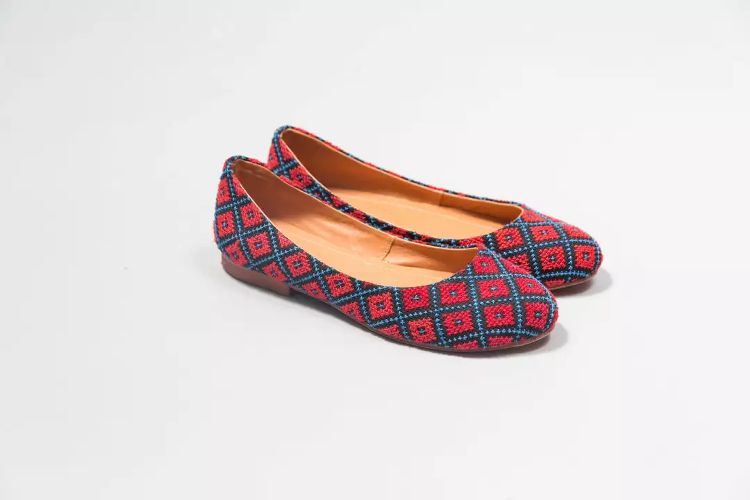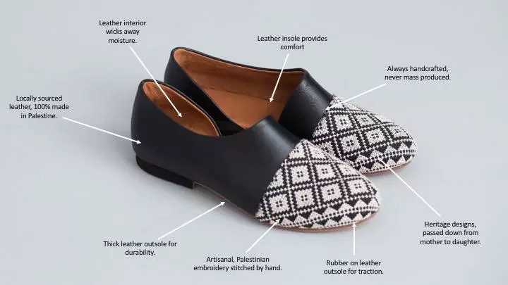 Ethical fashion from Palestine. The tatreez leather flats are a modern take on a traditional Palestinian art form. Each pair is hand-embroidered by refugee and low-income women artisans with traditional Palestinian tatreez design and then handcrafted with locally sourced leather in Al Khalil (Hebron).