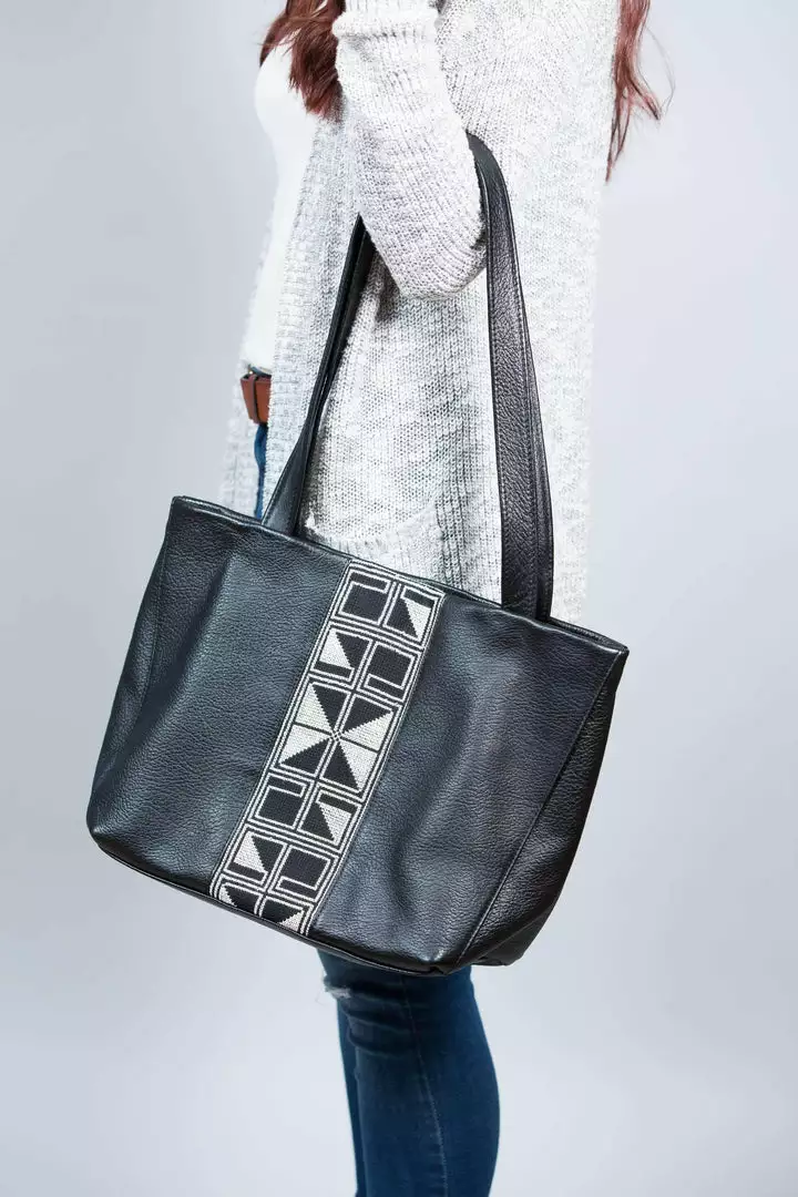 A market tote bag to carry everything you might need in a day. Each bag is hand-embroidered by refugee and low-income women artisans with a traditional Palestinian tatreez design, the “Road of Egypt” motif, and crafted with locally sourced leather in Al Khalil (Hebron). Lined with cotton and designed with an interior pocket, zipper closure and magnet snap.