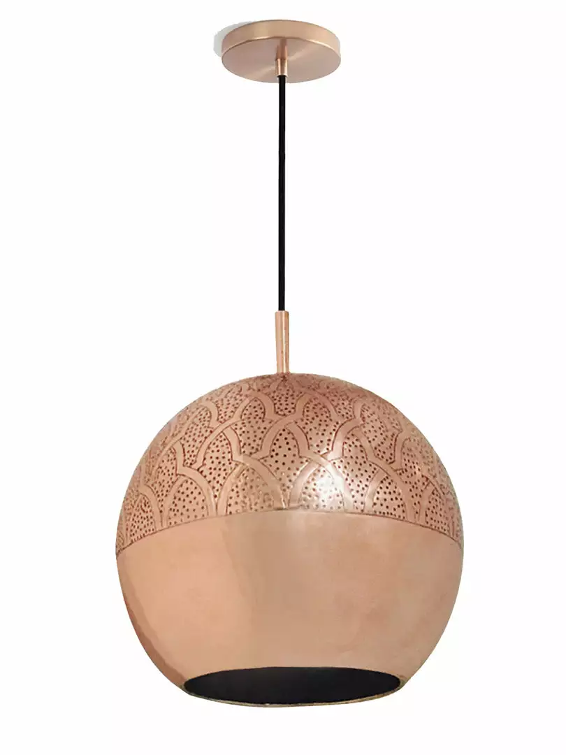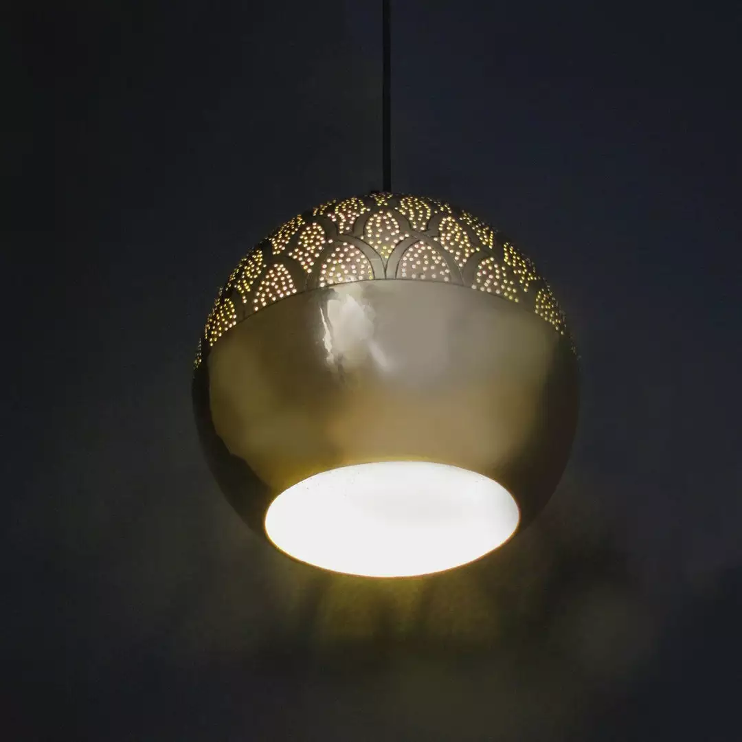 This modern Moroccan pendant light is a harmonious marriage between traditional craftsmanship and modern design. The negative space directs all focus to the elaborate design seen at the top of this exquisite pendant lamp. Nur casts brilliant shadows onto the ceiling, while creating a focused light at the base, making a perfect addition to dining and living spaces.