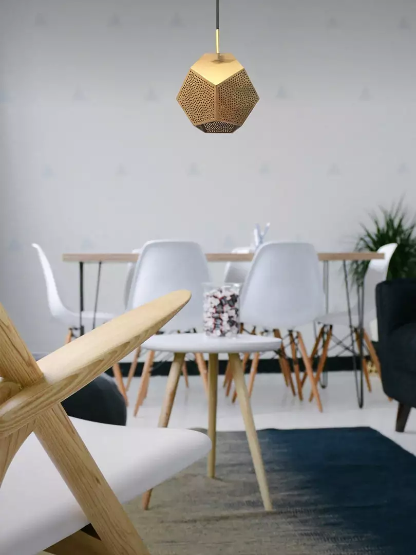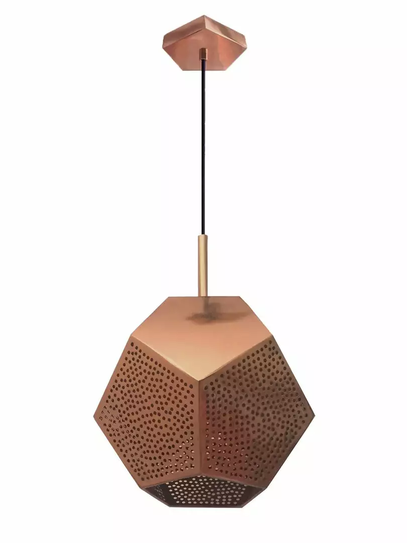 The Ula Pendant offers an intriguing, geometric design featuring a polished metal hexagonal shade. This bold and angular light fixture combines geometry and intricate Moroccan craftsmanship. The hand pierced shade casts a pattern of regal tranquility, directing movement of energy throughout the space. UL, cUL certified.