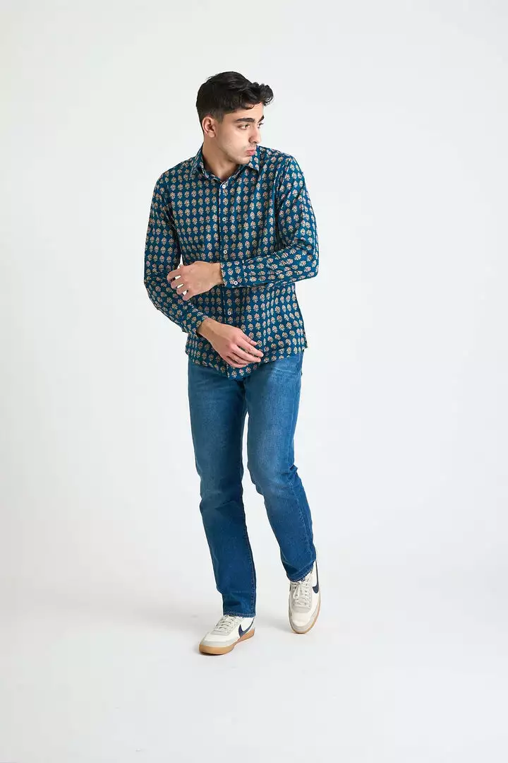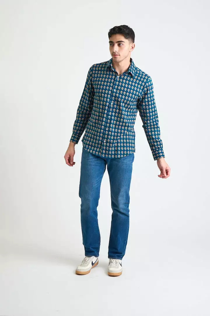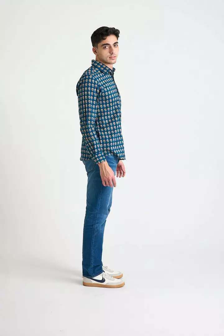 The Amir Shirt is a modern take on a classic long sleeve button down, featuring a red and off-white motif over blue fabric. Made in small batches with hand screen printed techniques, which results in natural inconsistencies giving this shirt an elevated, handcrafted look. Please note that the actual color may differ from the pictures due to computer lighting and hand-made nature of the fabric.