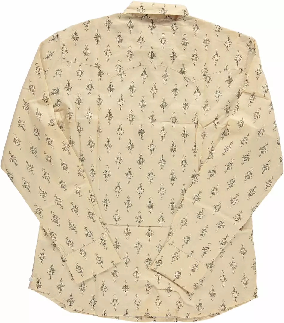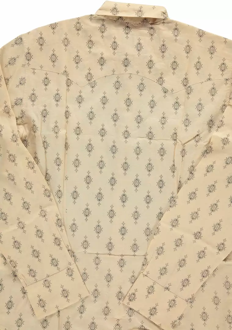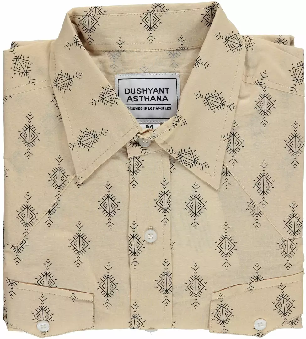 A western style men’s button down shirt with a hand printed motif on a cream background. The perfect addition to men’s sustainable wardrobes, this long sleeve button down can be dressed up or worn casually. Designed in Los Angeles and hand block printed in a fair trade environment in India.